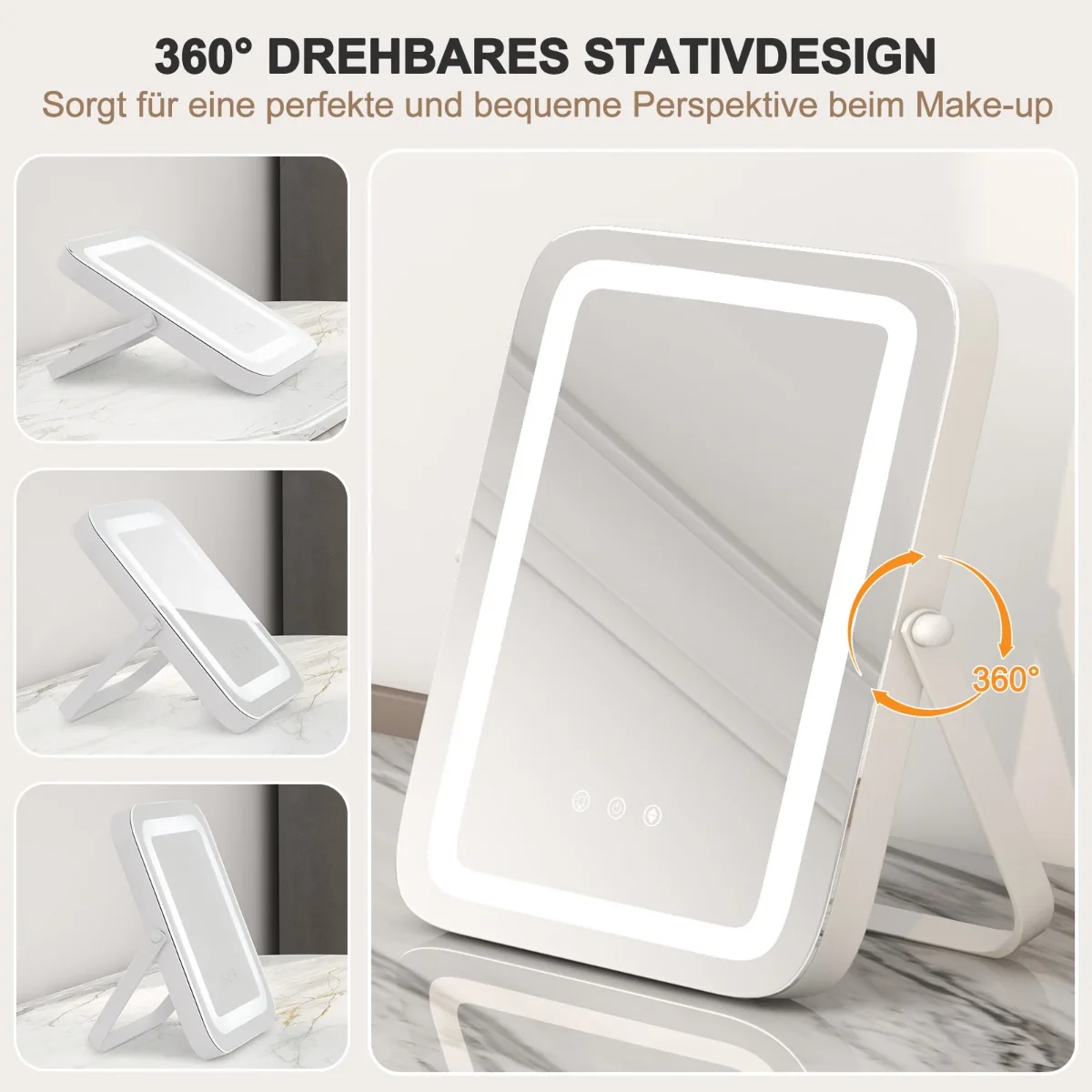 - 360° pasukamas stovas suteikia galimybę lengvai keisti veidrodžio padėtį sėdint ar stovint.