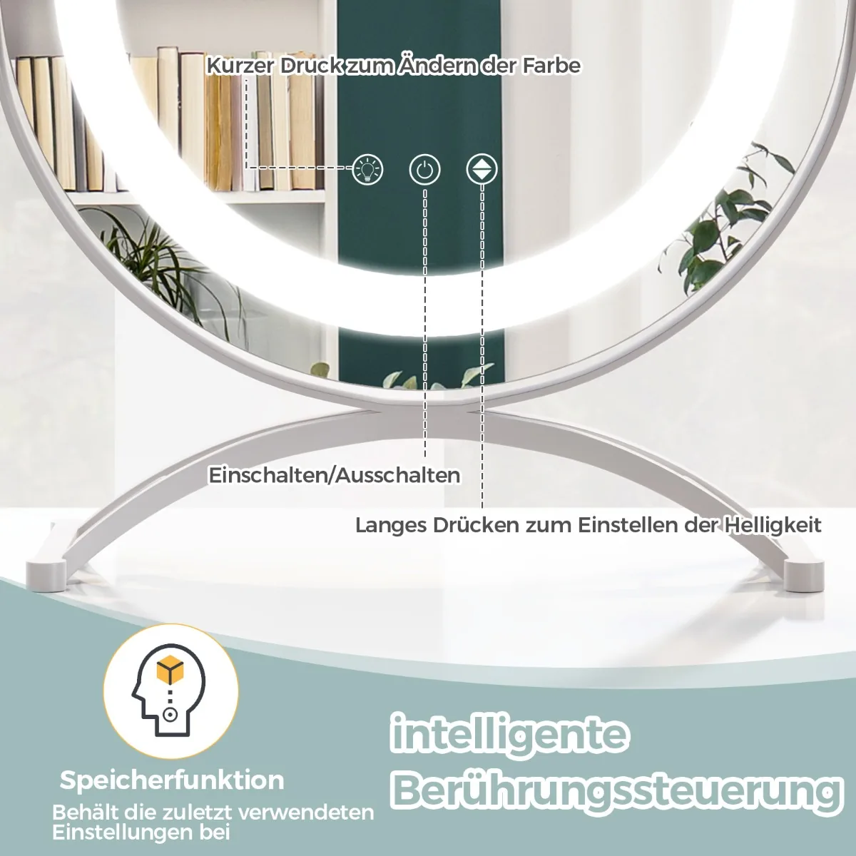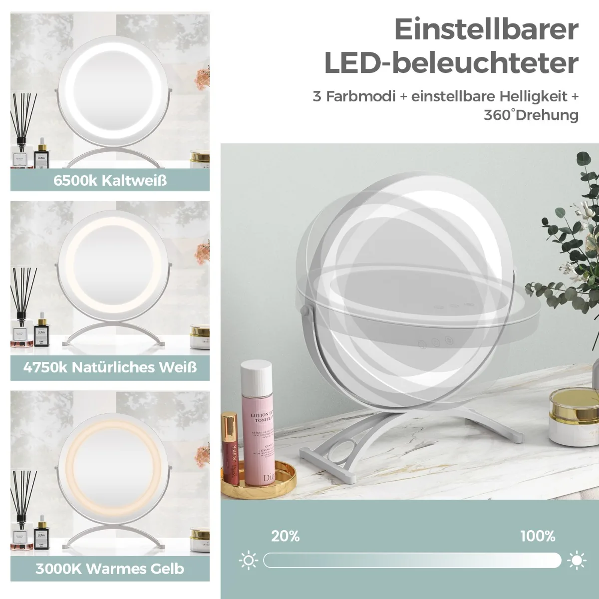 - LED apšvietimas su reguliuojamu ryškumu ir 3 spalvų režimais: 6500K šaltai baltas, 4750K natūraliai baltas ir 3000K šiltas geltonas.
