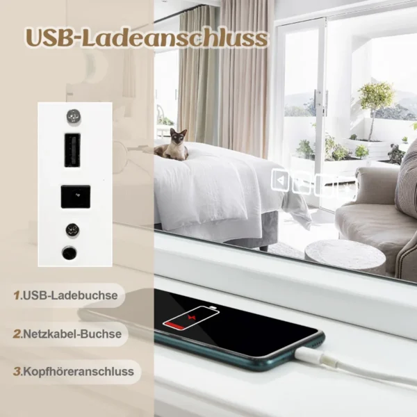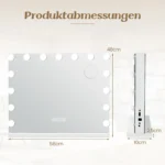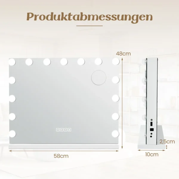 Makiažo veidrodis 58x10x48cm, baltos spalvos, skirtas tiksliai ir patogiai makiažo atlikimui bet kurioje erdvėje. Veidrodyje įmontuotos 15 lempučių apšvietimo sistema su trimis spalvų režimais suteikia natūralų ir ryškų atspindį. Integruoti belaidžiai garsiakalbiai ir USB prievadas praplečia veidrodžio funkcionalumą.