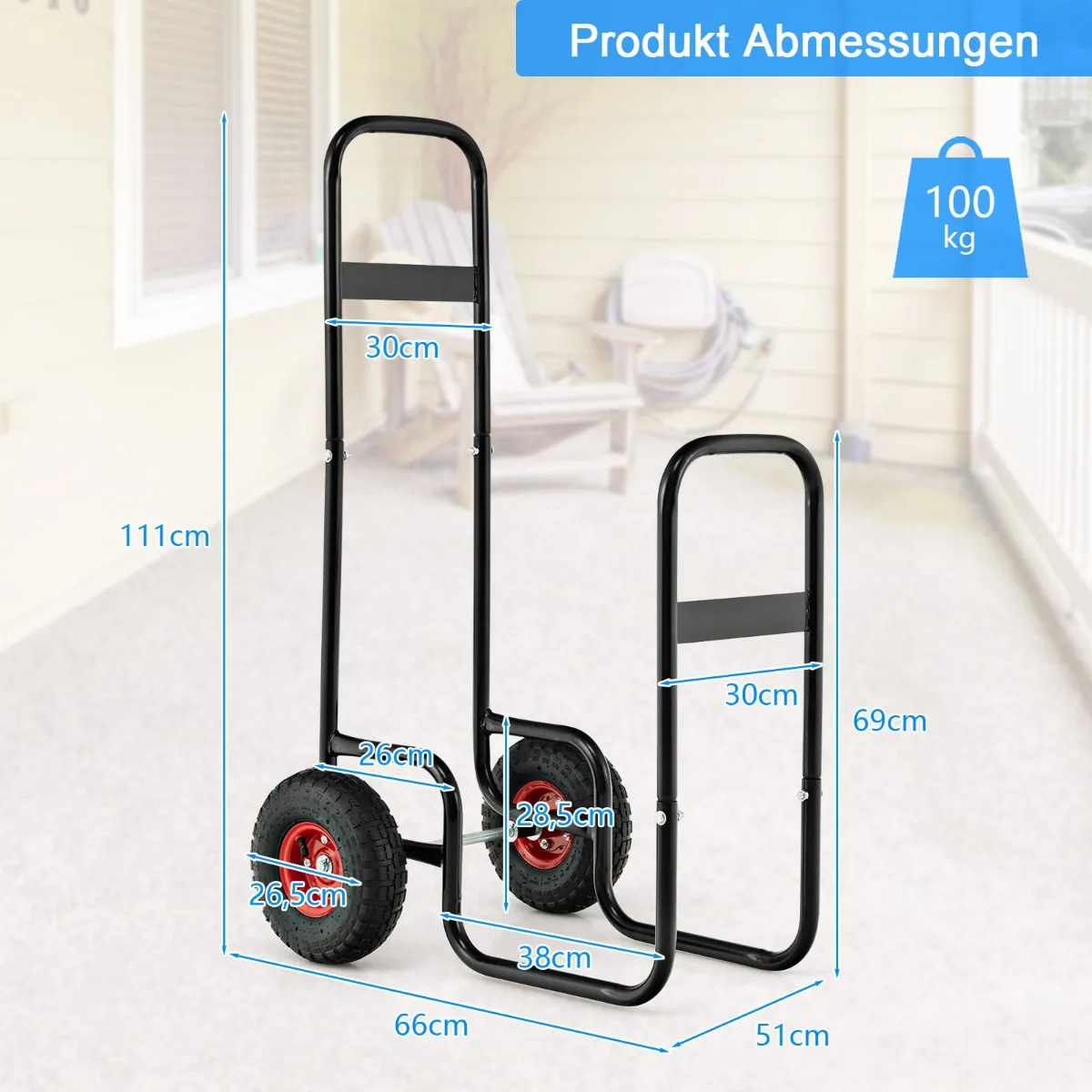 - Tvirtas metalinis rėmas leidžia vežti iki 100 kg malkų vienu metu.