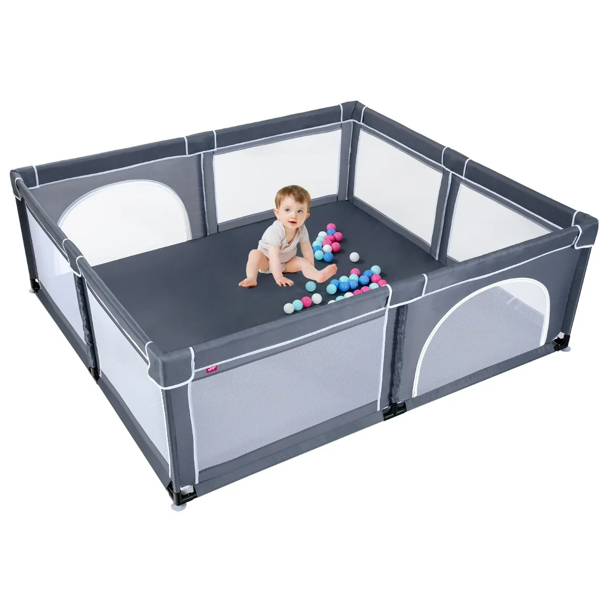 Maniežas 206×185,5x68cm, tamsiai pilkos spalvos suteikia vaikams saugią ir patikimą vietą žaidimams tiek namuose, tiek lauke. Dėl siurbtukų ir neslystančio dugno jis užtikrina stabilumą, o kvėpuojantis tinklinis audinys leidžia stebėti vaiką viso žaidimo metu.