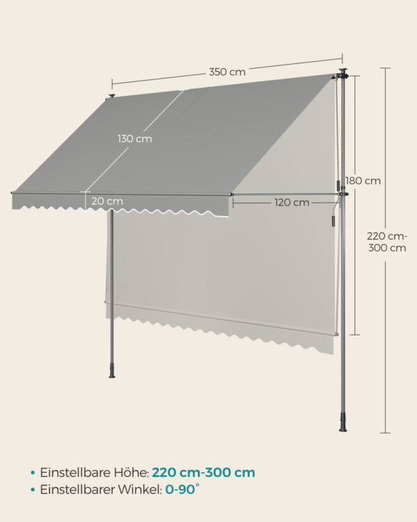- Aukštis: Reguliuojamas nuo 220 iki 300 cm – leidžia pritaikyti markizę pagal jūsų poreikius ir erdvės ypatumus.