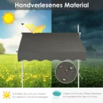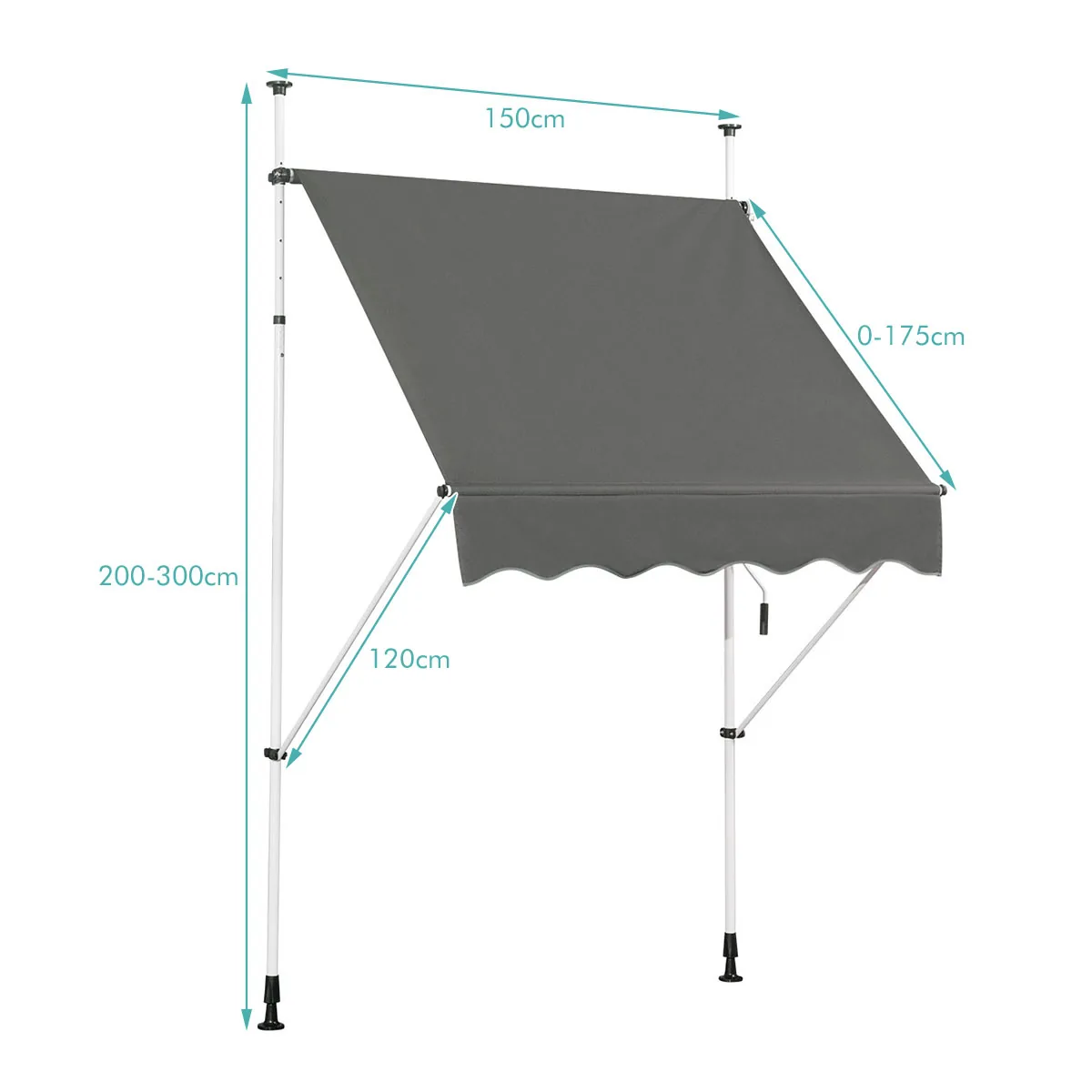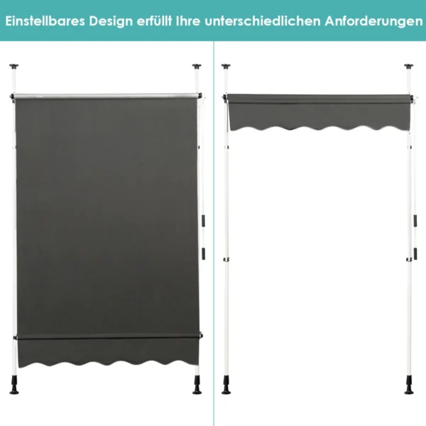 Markizė 175x150x300cm, tamsiai pilkos spalvos, yra praktiškas sprendimas apsaugai nuo saulės langų, terasų, balkonų ar sodo erdvių. Ištraukiamas tentas pagamintas iš atsparaus Oksfordo audinio su PU danga, o tvirtas aliuminio rėmas užtikrina stabilumą ir ilgaamžiškumą.