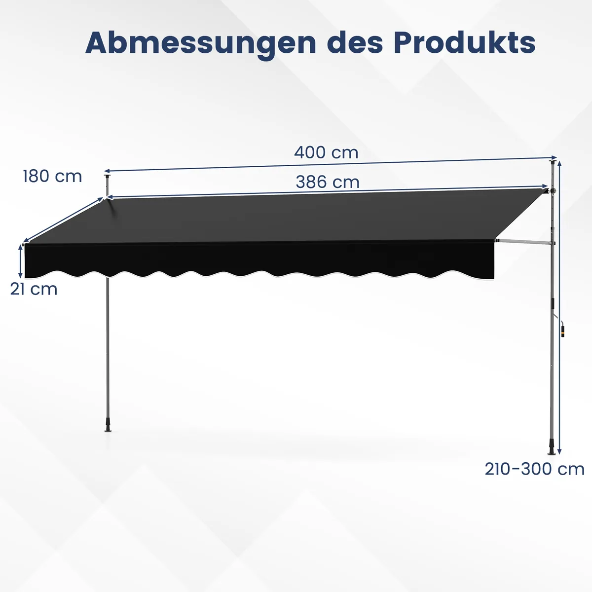 Markizė 180x400x300cm juodos spalvos – praktiškas sprendimas kiemui ar terasai apsaugoti nuo saulės. Pagaminta iš poliesterio su vandeniui atsparia PU danga, ši rankiniu būdu ištraukiama markizė lengvai reguliuojama ir patvari.