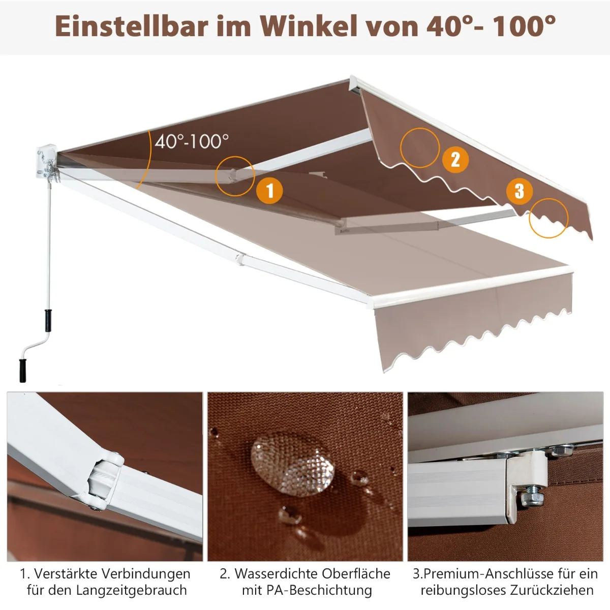 - Reguliuojamas kampas tarp markizės ir sienos nuo 40° iki 100°.