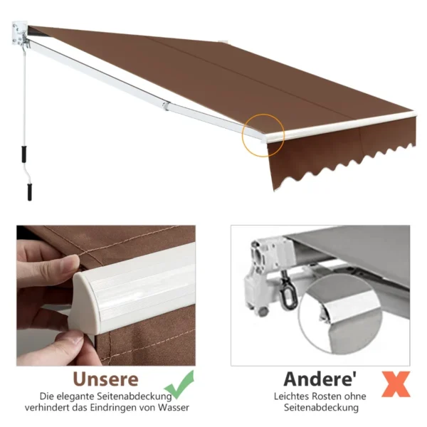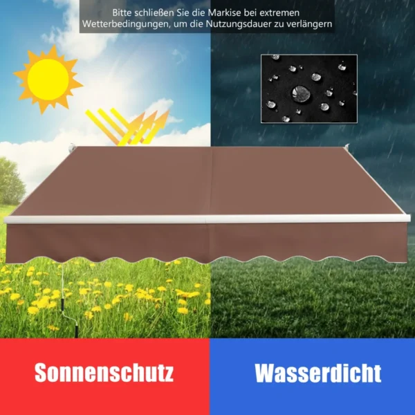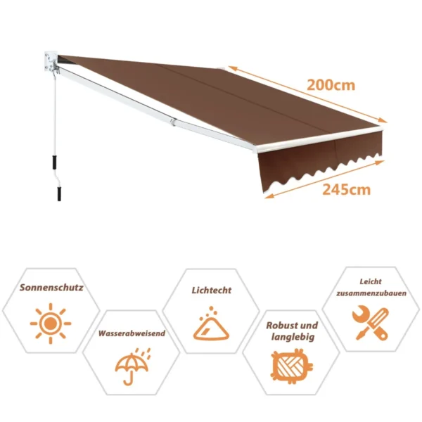 Markizė 245x200cm rudos spalvos – praktiškas sprendimas jūsų terasai, balkonui ar lauko zonai. Ištraukiama markizė suteikia pakankamą šešėlį ir apsaugo nuo saulės bei lietaus, efektyviai reguliuojant atspalvį pagal poreikį.