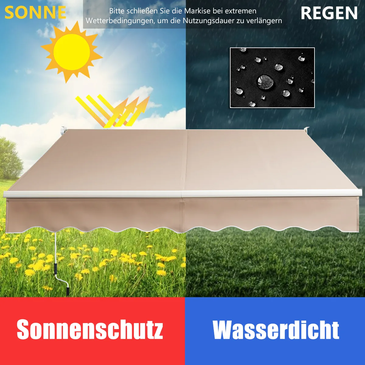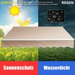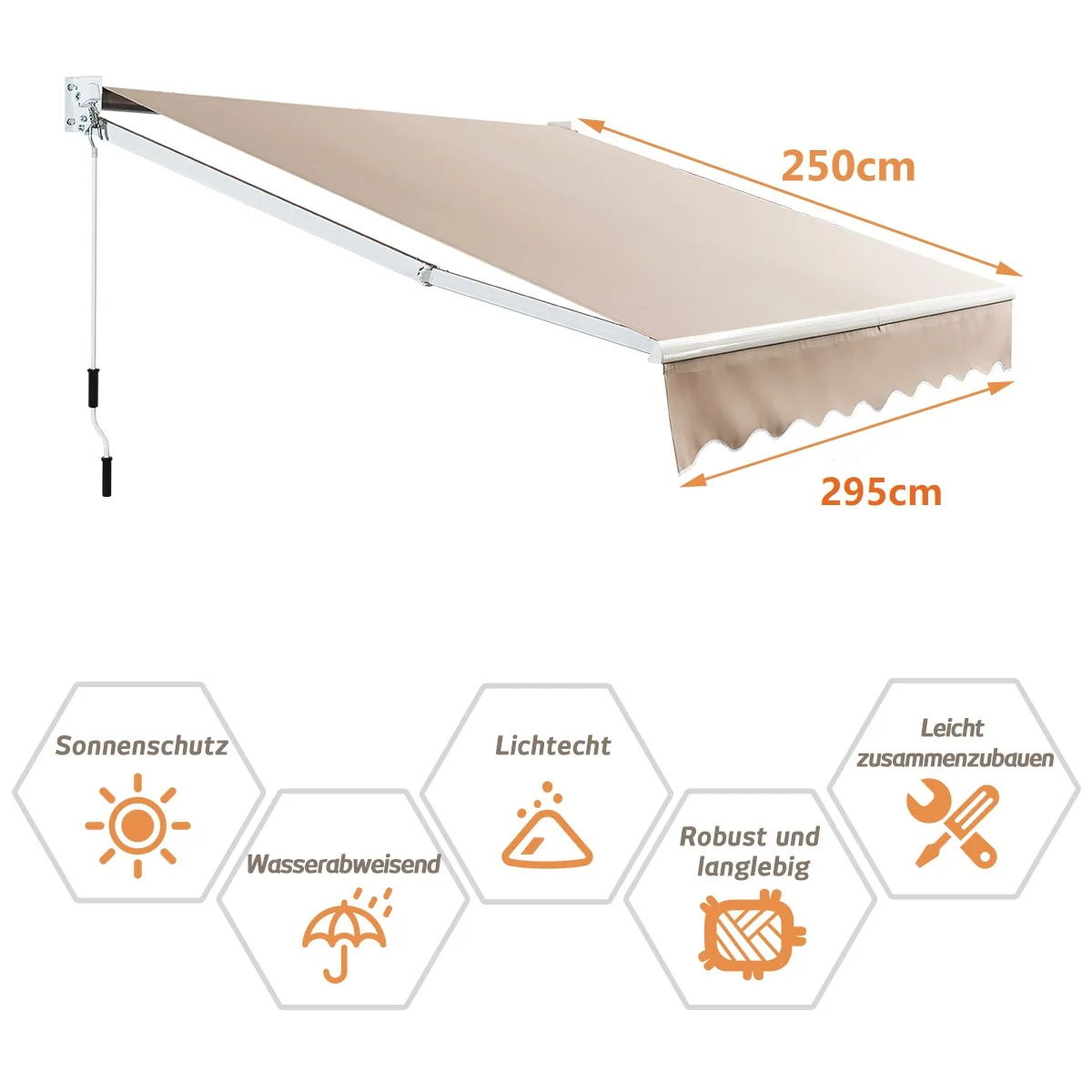 Markizė 295x250cm, smėlio spalvos – praktiškas sprendimas jūsų terasai ar balkonui apsaugoti nuo saulės ir lietaus. Ištraukiama markizė su reguliuojamu kampu leidžia lanksčiai pritaikyti šešėlį pagal poreikį, užtikrinant komfortą šiltomis dienomis.