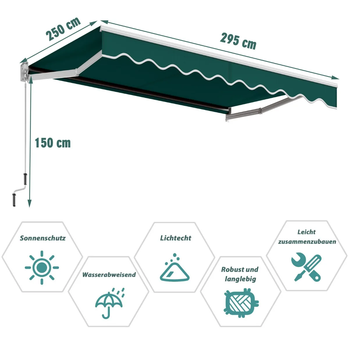Markizė 295x250x150 cm, žalios spalvos – funkcionalus ištraukiamas tentas, kuris užtikrina efektyvų pavėsį terasoms, balkonams ar kavinėms. Reguliuojamas kampas ir patogi valdymo sistema leidžia lengvai pritaikyti šešėliui pagal poreikį.