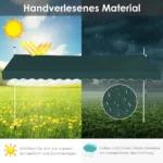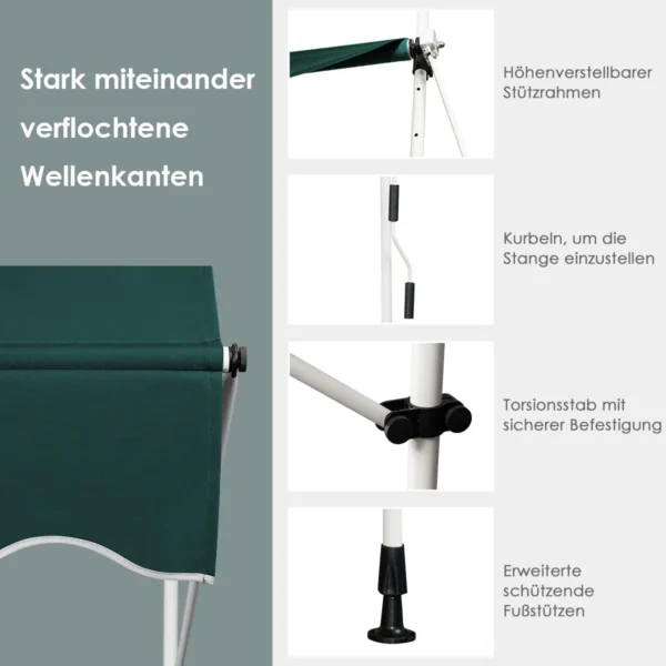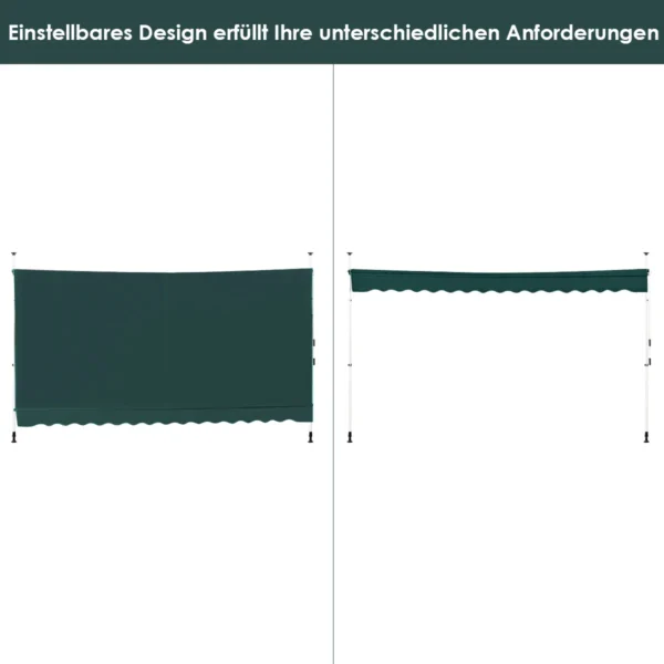 Markizė 400x175x300cm, žalios spalvos, yra praktiškas sprendimas apsaugai nuo saulės jūsų terasoje, balkone ar sode. Ištraukiama konstrukcija leidžia lanksčiai reguliuoti pavėsį, o atsparus oro sąlygoms oksfordo audinys užtikrina ilgaamžiškumą. Aliuminio rėmas suteikia stabilumą ir patikimumą įvairiomis sąlygomis.