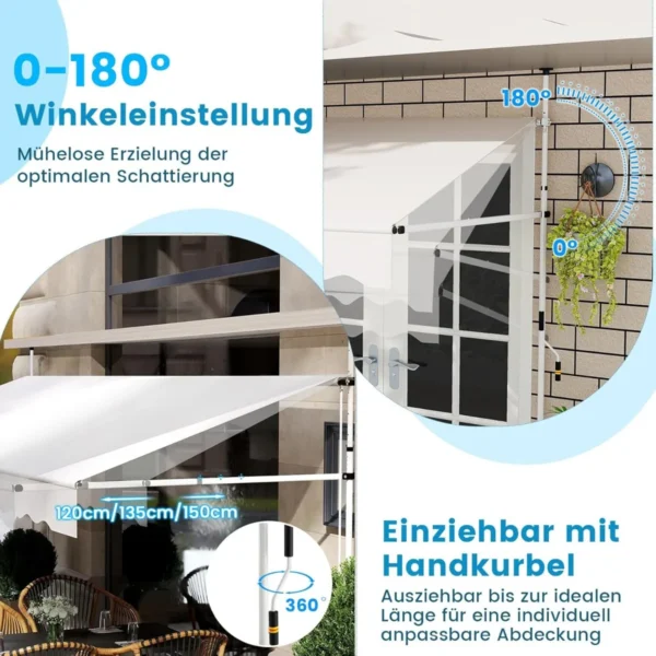 - Rankiniu būdu ištraukiama markizė su alkūnine rankena, leidžianti kontroliuoti šešėlio ilgį ir kampą.