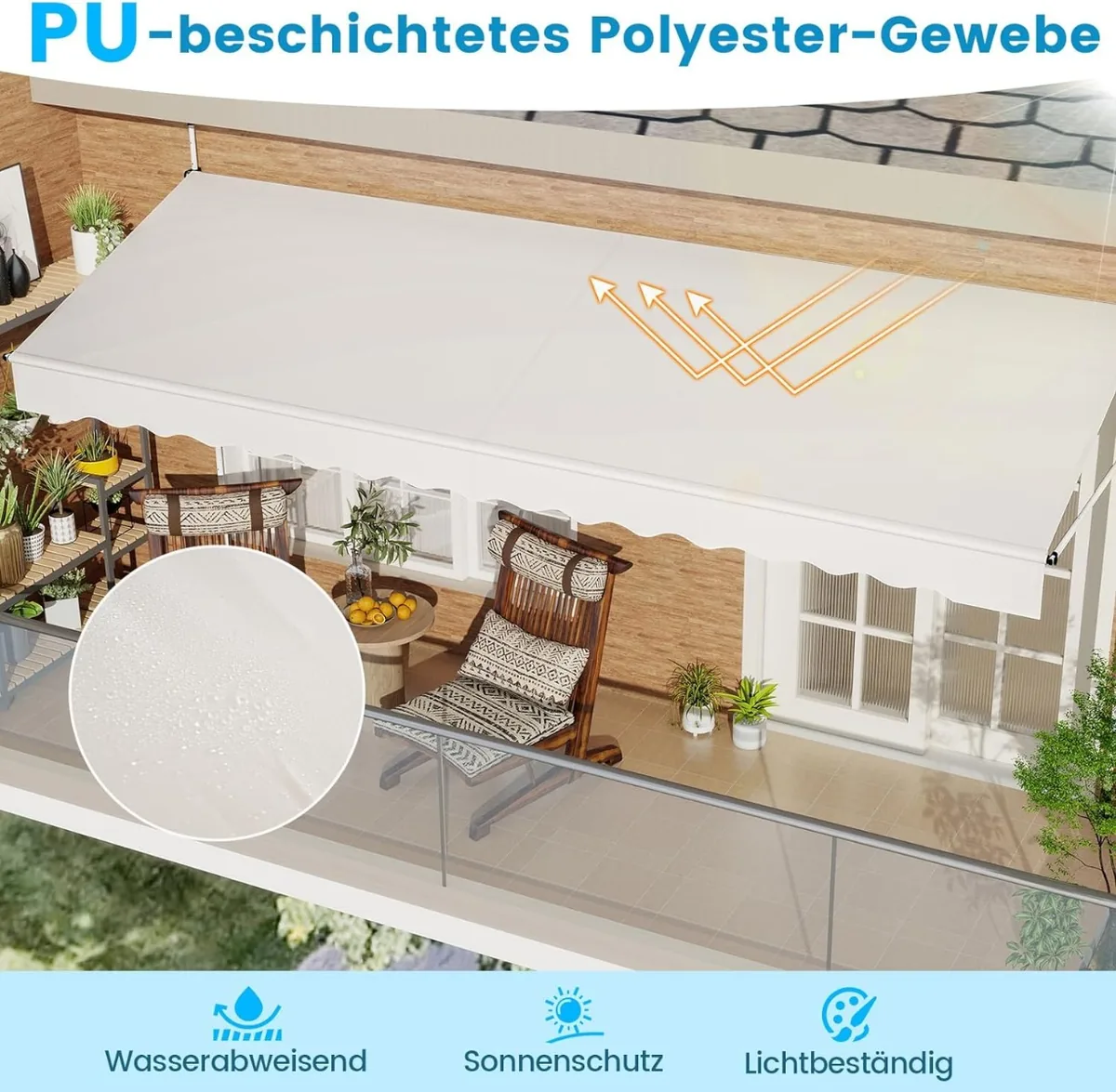 - Poliesterio audinys su PU danga yra atsparus vandeniui ir saugo nuo saulės.