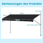 Markizė 400x210x300 cm juodos spalvos – rankiniu būdu ištraukiamas saulės skydelis, tinkantis terasoms, balkonams ir sodams. Poliesterio audinys su vandeniui atsparia PU danga užtikrina apsaugą nuo saulės ir drėgmės, o reguliuojami metaliniai atraminiai stulpai leidžia pritaikyti tentą pagal poreikius.