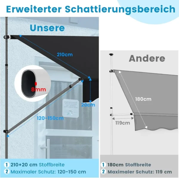 - Pasvirimo kampas reguliuojamas nuo 0° iki 180° optimaliam šešėlį kontroliuoti.