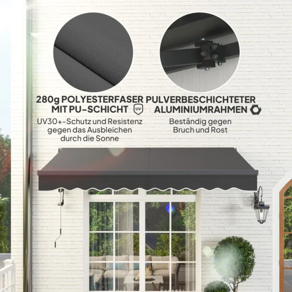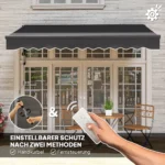 Mėgaukitės lauke stilingai naudodami elektrinę markizę Outsunny! Šią sodo tentą galima lengvai išplėsti nuotolinio valdymo pulteliu arba sukant rankinį švaistiklį. Pagaminta iš rūdims atsparaus aliuminio ir 280 g/m² poliesterio, kuris blokuoja UV spindulius, ištraukiamas balkono tentas reguliuojamas nuo 45° iki 85°, kad jūsų terasoje arba priešais langą būtų puikus šešėlis.