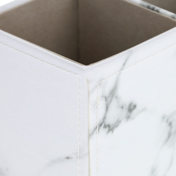 Įneškite elegancijos ir tvarkos į savo darbo erdvę su šiuo išskirtiniu marmurinės išvaizdos rašymo priemonių organizatoriumi. Jo subtilus baltos ir pilkos spalvų derinys suteikia prabangos pojūtį, o funkcionalus dizainas padeda palaikyti tvarką.