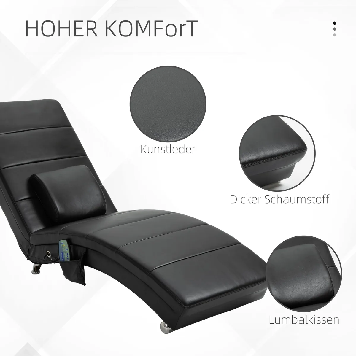 Panerkite į šio prabangaus atlošimo patogumą. Mūsų poilsio kėdė ne tik gerai atrodo, bet ir kviečia atsipalaiduoti bei atsipalaiduoti. Aštuoni vibracijos taškai masažuoja visą kūną ir užtikrina tikras geros savijautos akimirkas. Ši atsipalaidavimo kėdė stebina ne tik prabangiu dizainu, pagaminta iš juodos dirbtinės odos, bet ir raminančia masažo funkcija.