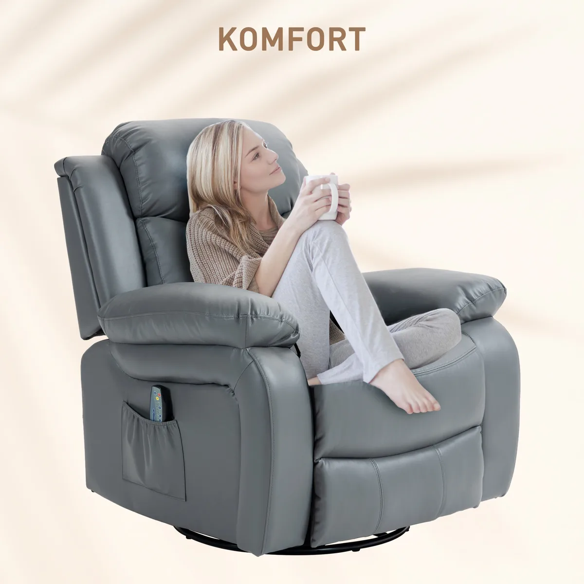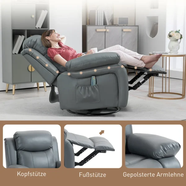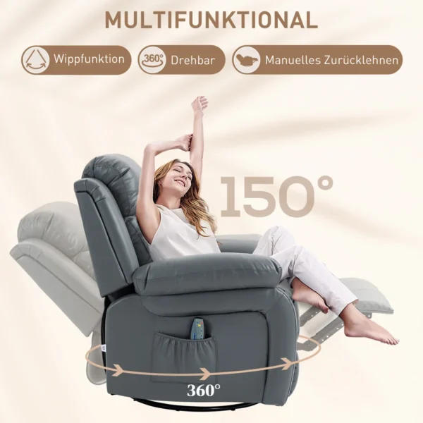 Atraskite maksimalų komfortą naudodami šį HOMCOM atlošą su masažo funkcija! Pasinerkite į gryną komfortą – stovėdami arba gulėdami, o dėl laisvai besisukančios sėdynės mėgaukitės neribota judėjimo laisve. Ši TV kėdė su 8 vibracijos taškais suteikia raminamąjį juosmens, šlaunų ir blauzdų masažą. Patogiai valdykite masažo funkciją nuotolinio valdymo pulteliu ir pasinerkite į svajingą atsipalaidavimą.