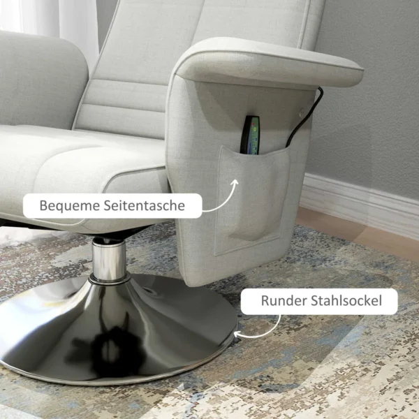 Po įtemptos dienos galite atsisėsti, atsipalaiduoti ir mėgautis maloniu masažu šioje HOMCOM atlošiamoje kėdėje. Masažo taškai lepina nugarą, juosmeninę stuburą, šlaunis ir kojas. Galite pasirinkti automatinę masažo funkciją iš anksto užprogramuotiems masažams arba rankinį skirtingų masažo zonų pasirinkimą pagal savo pageidavimus. Šis komplektas, kurį sudaro atlošas ir pufas, siūlo atsipalaidavimą paspaudus mygtuką ir kviečia pailsėti bei pasilikti.