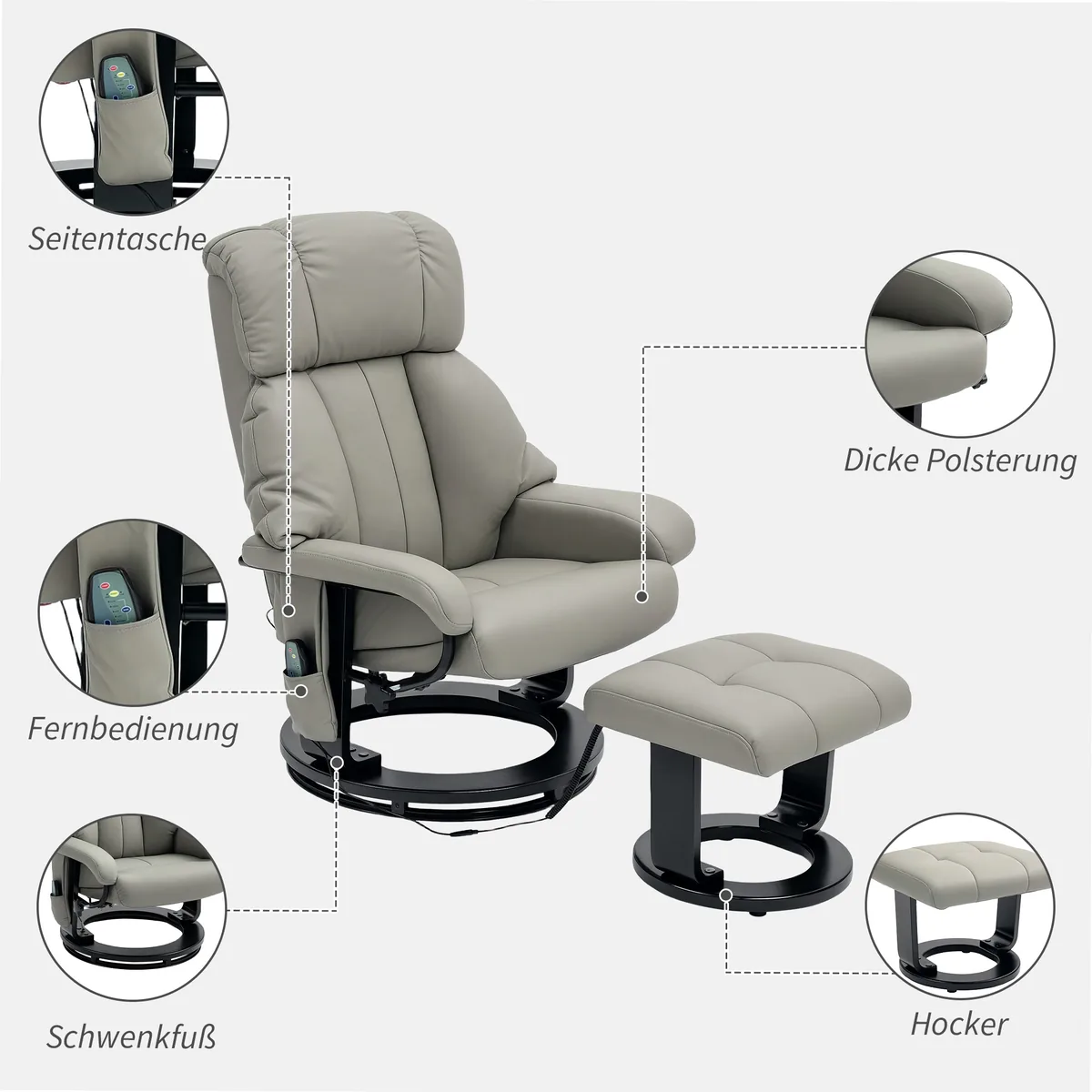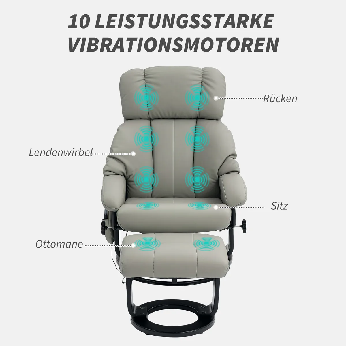 - ✔ 10 siūbuojamų masažo taškų (6 nugaroje, 2 sėdynėje, 2 taburete)