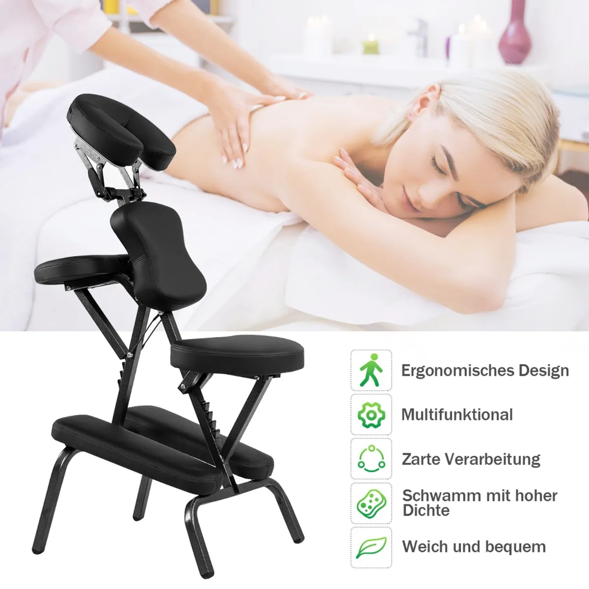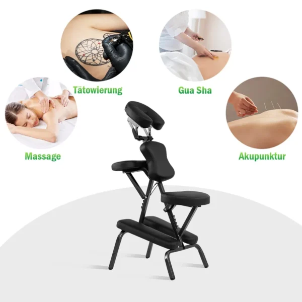Masažo kėdė 46×54,5×120,5 cm juodos spalvos skirta tiek profesionaliam, tiek namų naudojimui. Patogus, sulankstomas dizainas ir lengvas svoris leidžia kėdę paprastai pernešti bei laikyti įvairiose vietose. Kėdė pagaminta iš patvarių medžiagų, užtikrinančių ilgalaikį naudojimą ir komfortą.