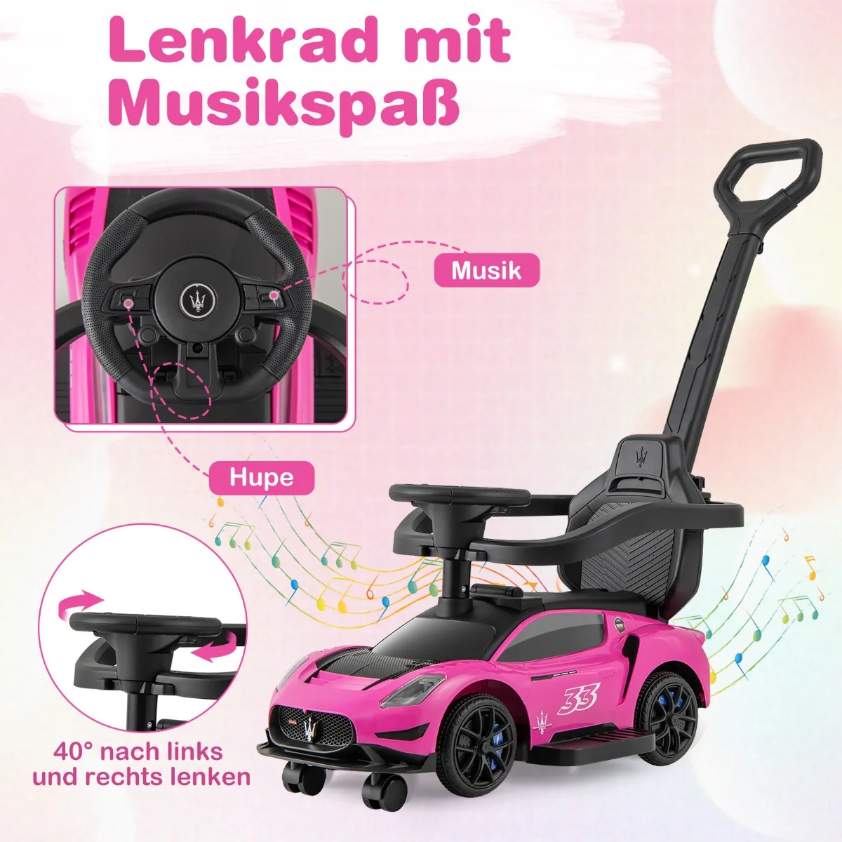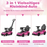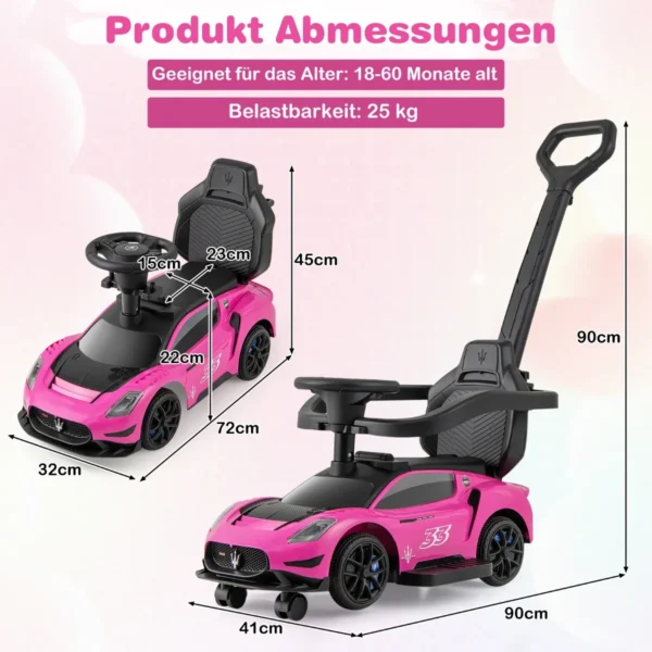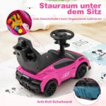 Mašina stumdukas su rankena 90x41x90cm, rožinės ir juodos spalvos, yra daugiafunkcis vaikams skirtas žaislas, pritaikytas nuo 18 iki 60 mėnesių. Šis „trys viename“ automobilis leidžia vaikams važinėtis ir žaisti įvairiais režimais, skatinant judėjimą bei vaizduotę. Įrengtas muzikiniu vairu, apsauginiais turėklais bei patvariais ratais, jis yra saugus ir patogus pasirinkimas mažyliams.