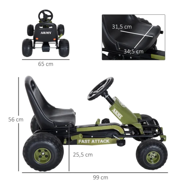 Mūsų vaikiškų kartingų iš HOMCOM vairavimo malonumas yra labai svarbus. Tvirtas armiškas jūsų vaikiškos transporto priemonės dizainas verčia jus išeiti į lauką, todėl valandos vairavimo ir linksmybių yra garantuotos. Grandininė pavara saugiai paslėpta po purvasargiu, o stabdymas atliekamas rankiniu stabdžiu. Tai reiškia, kad jūsų vaikas gali saugiai sustoti net visu greičiu. Jį galima lanksčiai reguliuoti į priekį arba atgal, kad jūsų jaunieji lenktynininkai visada sėdėtų patogiai.