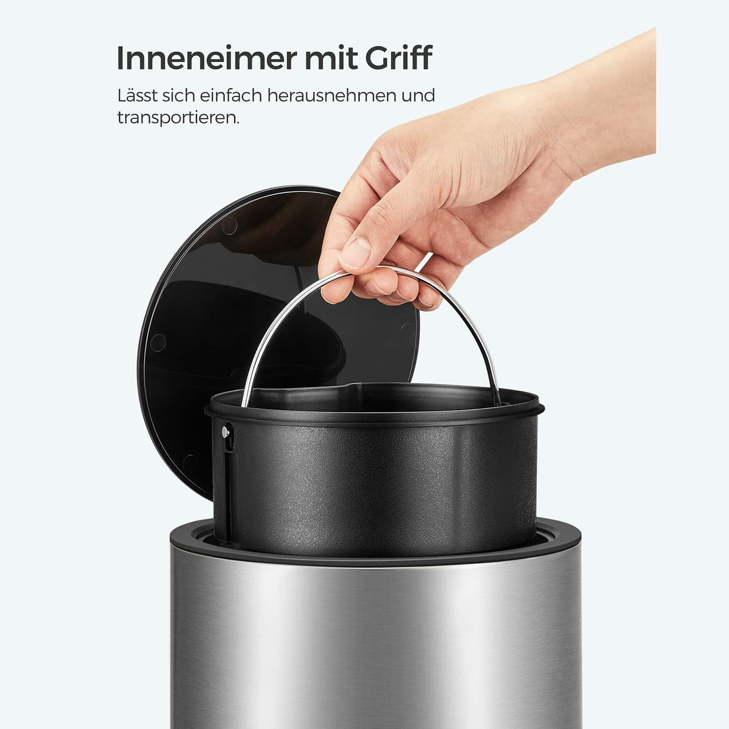 - Medžiaga: Išorė pagaminta iš plieno, dangtis iš ABS plastiko, vidinė šiukšliadėžė iš PP plastiko