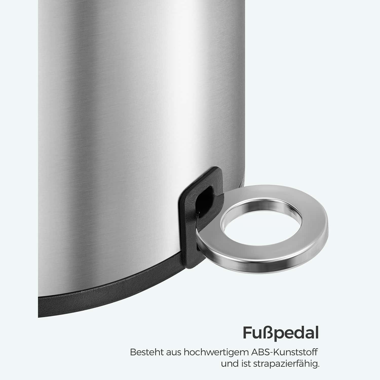 Šiukšliadėžė turi minkštą ir tyliai užsidarantį dangtį, kuris padeda išvengti triukšmo. Tvirtas ir patvarus kojinis pedalas leidžia lengvai atidaryti dangtį, o neslystančios pagalvėlės apsaugo grindis nuo subraižymų ir užtikrina stabilumą.
