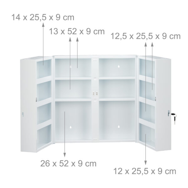 - Didelė talpa: Spintelė turi 11 skirtingų dydžių skyrių, kurie suteikia pakankamai vietos vaistams, tvarsčiams ir kitoms pirmosios pagalbos priemonėms.