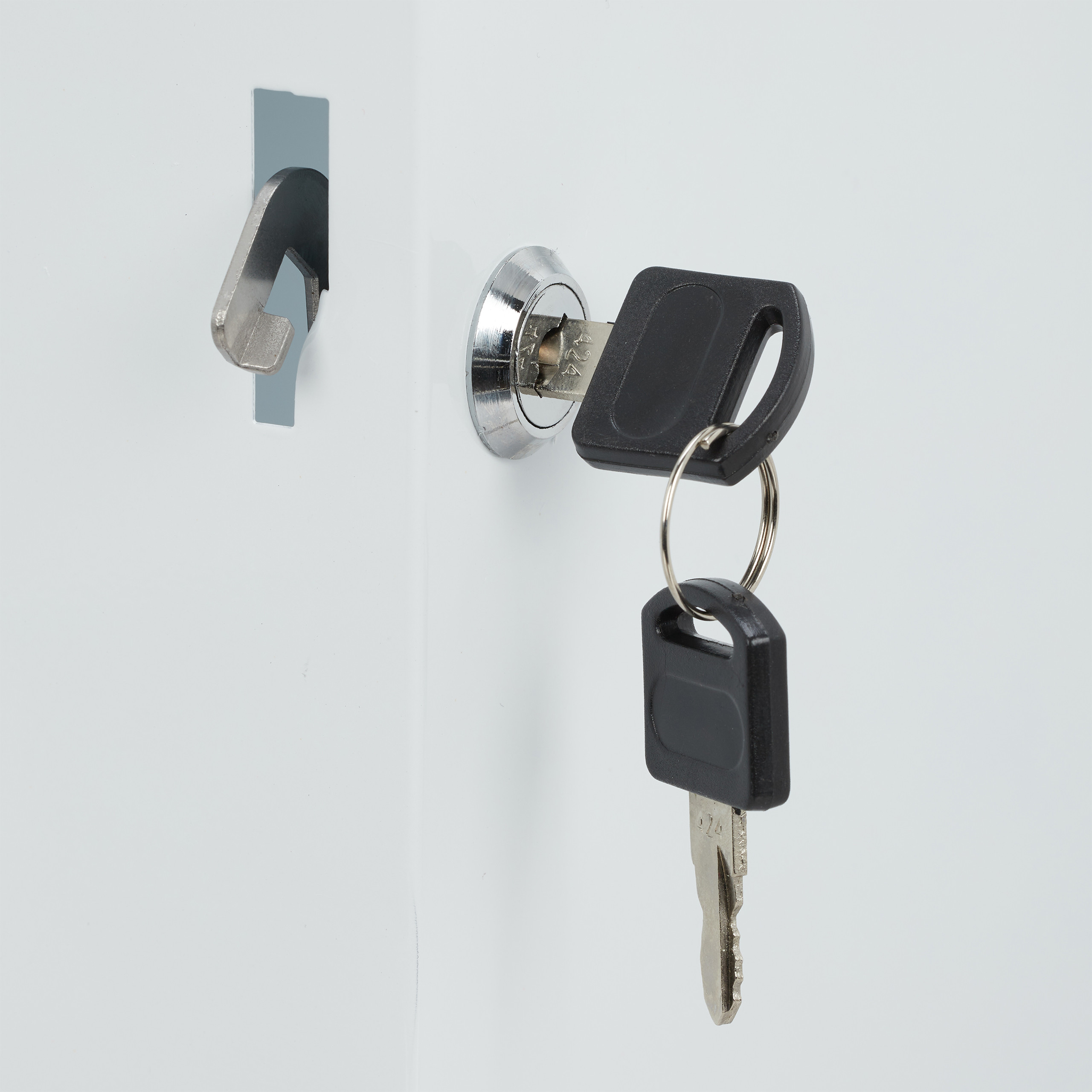 - Saugumas: Siekiant apsaugoti nuo vaikų ar pašalinių asmenų, spintelė yra rakinama pridedamais raktais.