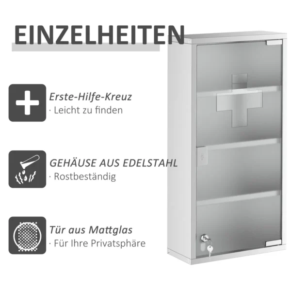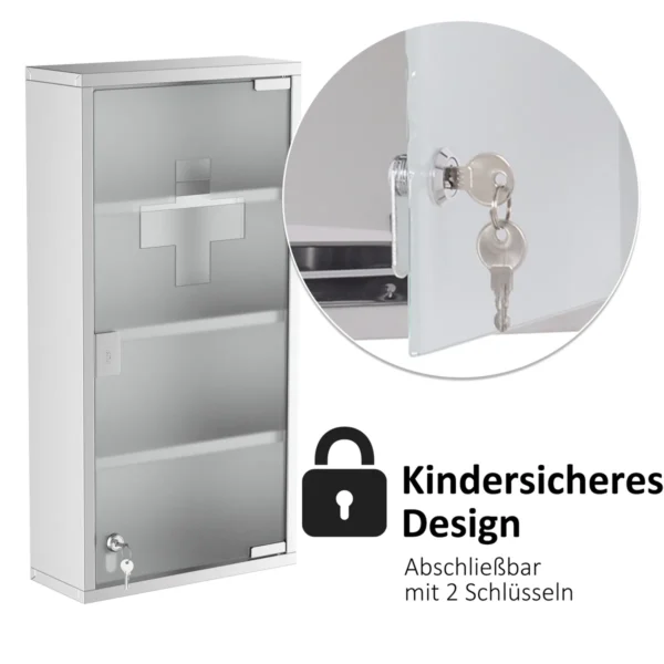 Įdėkite savo mažą namų medicinos spintelę su saugumo jausmu. Mūsų vaistinėlėje. Jis pagamintas iš aukštos kokybės nerūdijančio plieno, todėl yra atsparus rūdims ir patvarus. Iš dalies matinio stiklo durys gali būti užrakinamos, jose sumontuota automatika. Tai reiškia, kad duris galima lengvai atidaryti viena ranka. Net neturėdami jokių rankinių įgūdžių, vaistinėlę nesunkiai surinksite ir pritvirtinsite prie sienos. Kad jūsų vaistai ir vaistai būtų saugiai laikomi ir visada po ranka.