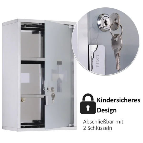 Įdėkite savo mažą namų medicinos spintelę su saugumo jausmu. Mūsų vaistinėlėje. Jis pagamintas iš aukštos kokybės nerūdijančio plieno, todėl yra atsparus rūdims ir patvarus. Iš dalies matinio stiklo durys gali būti užrakinamos, jose sumontuota automatika. Tai reiškia, kad duris galima lengvai atidaryti viena ranka. Net neturėdami jokių rankinių įgūdžių, vaistinėlę nesunkiai surinksite ir pritvirtinsite prie sienos. Kad jūsų vaistai ir vaistai būtų saugiai laikomi ir visada po ranka.