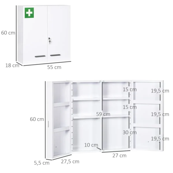 - Sandėliavimo vieta: ši sieninė spintelė su 6 lentynomis tinka medicinos reikmenims, receptiniams vaistams ir panašiems produktams laikyti. Užpakalinėje durelių dalyje yra 3 skyriai mažesniems vaistų buteliukams.