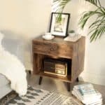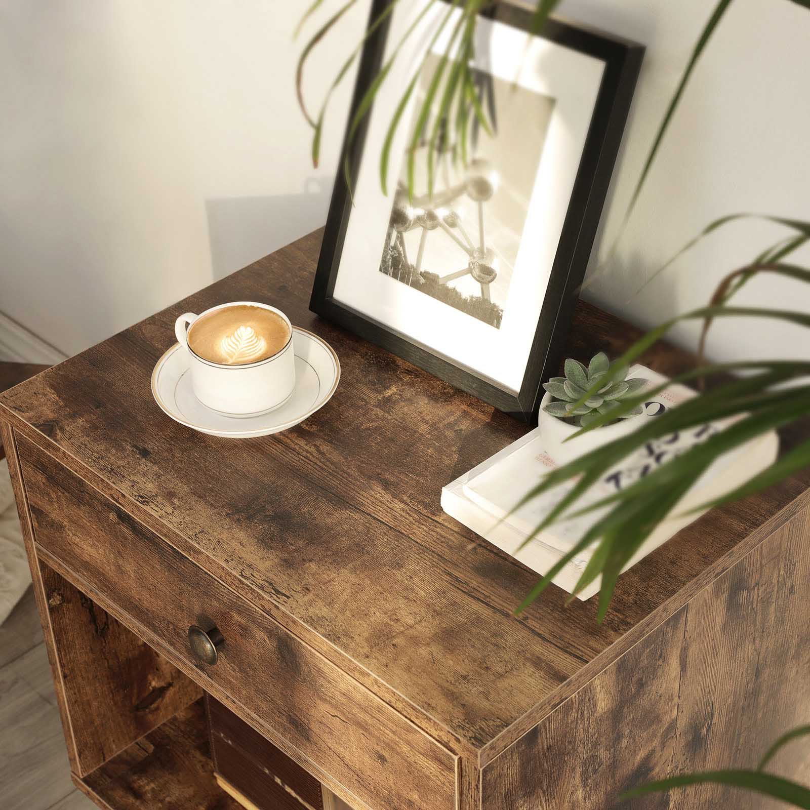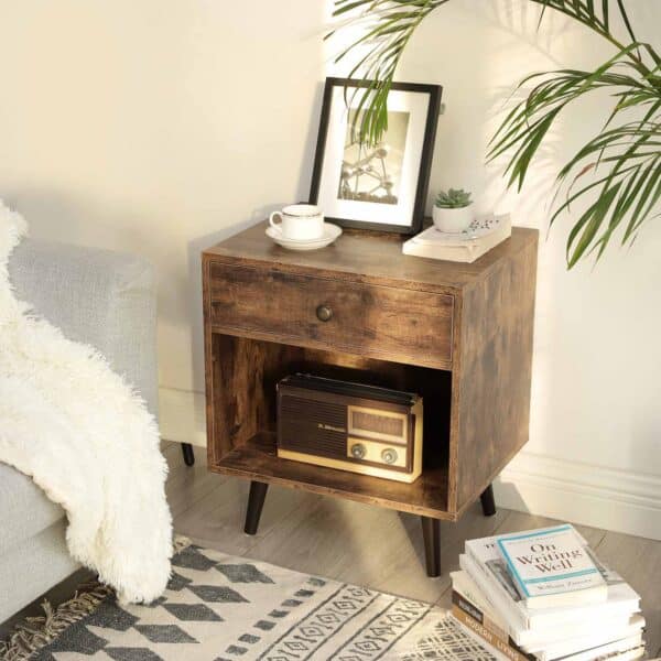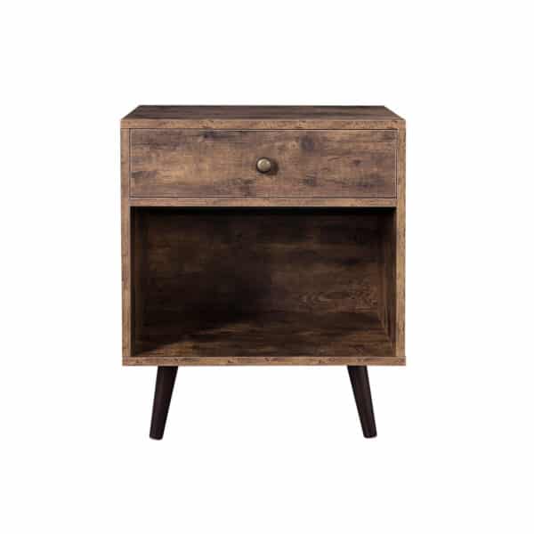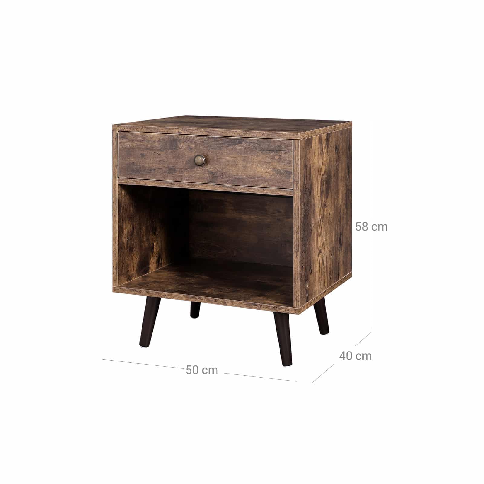 Šis medinis naktinis staliukas, kurio matmenys yra 50 x 40 x 58 cm, puikiai tiks jūsų miegamajam. Tamsiai rudos spalvos ir vintažinio stiliaus dizainas suteiks jūsų interjerui elegancijos ir šilumos.