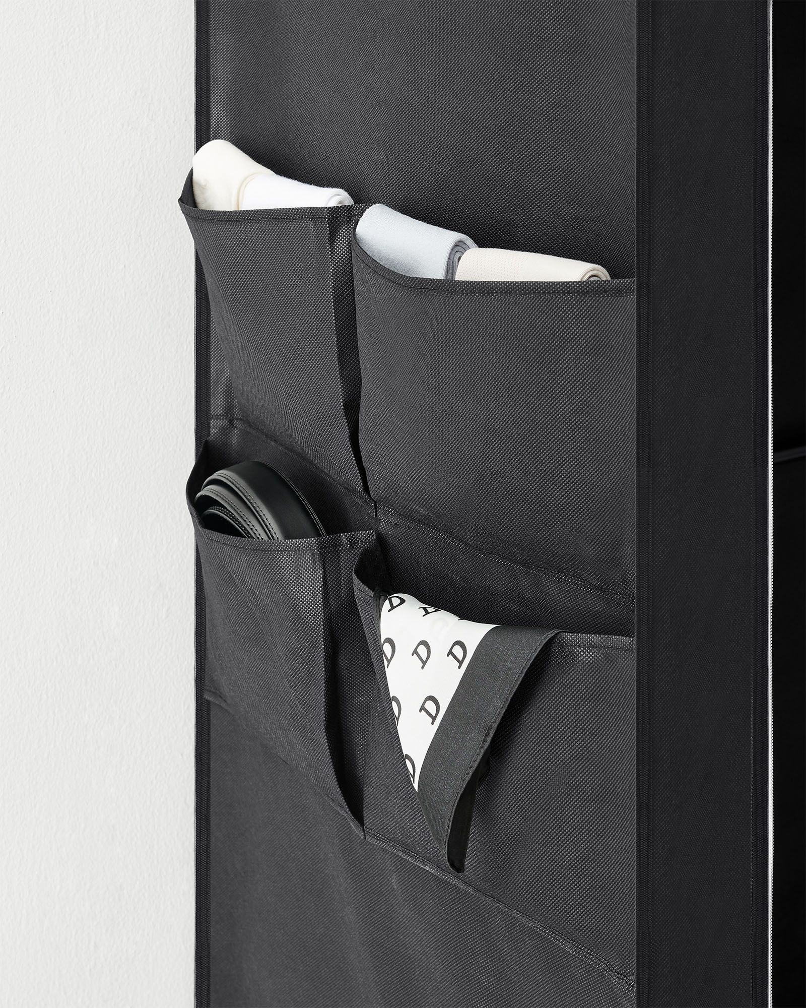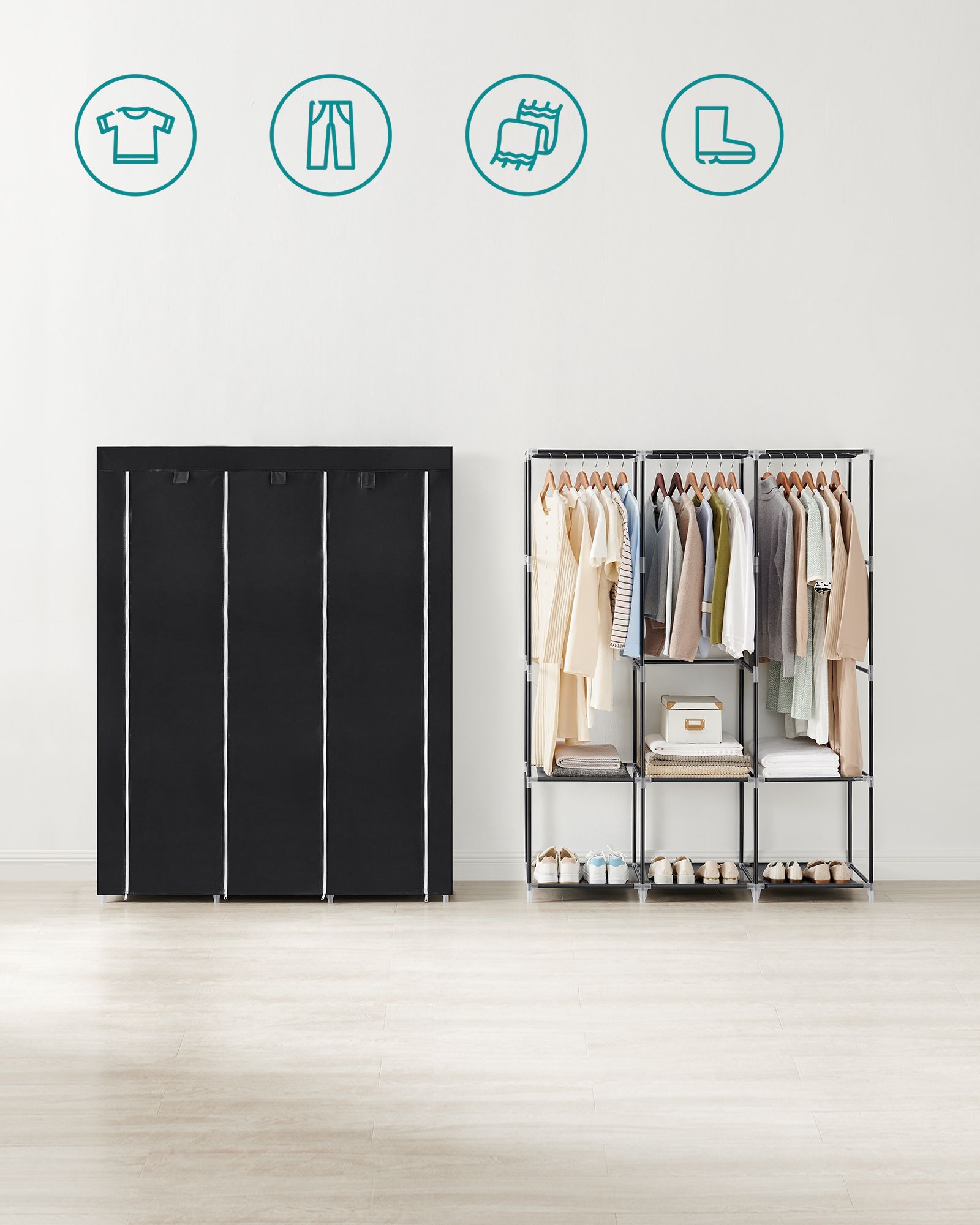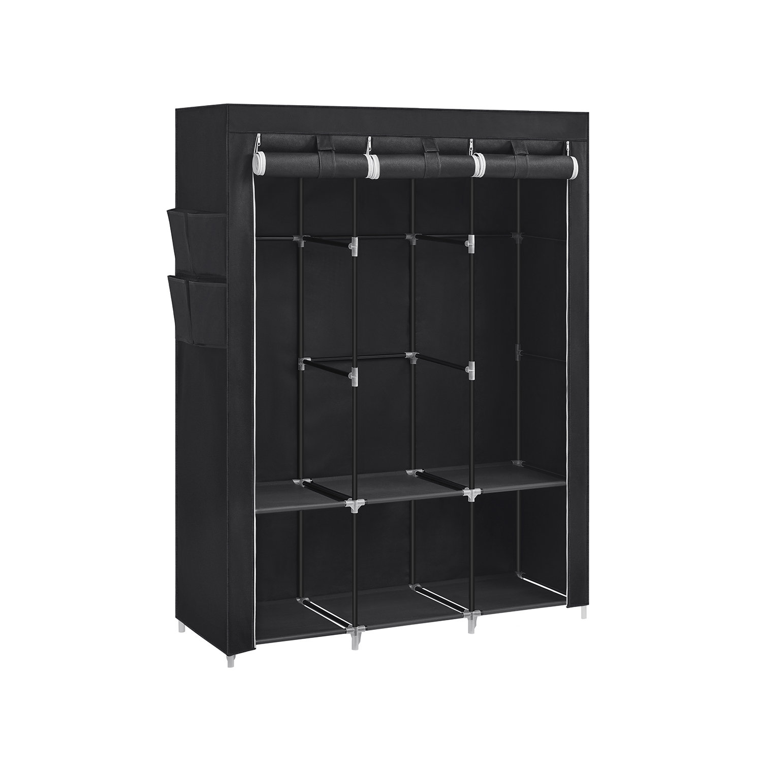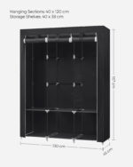 Ši elegantiška ir funkcionali medžiaginė drabužių spinta yra puikus sprendimas tiems, kurie ieško praktiško ir stilingo būdo organizuoti savo drabužius. Juodos spalvos dizainas suteikia modernumo ir lengvai derinasi su bet kokiu interjeru.