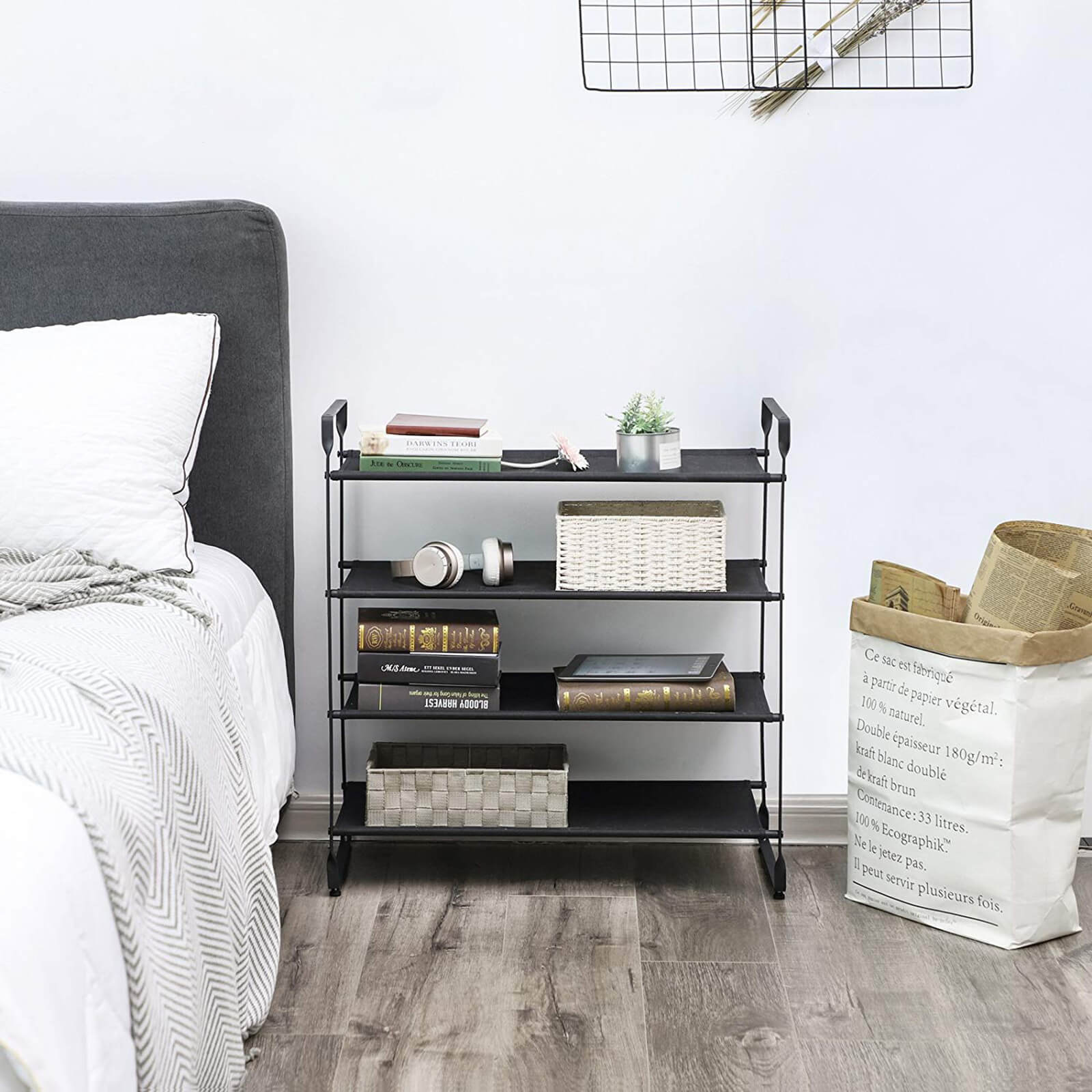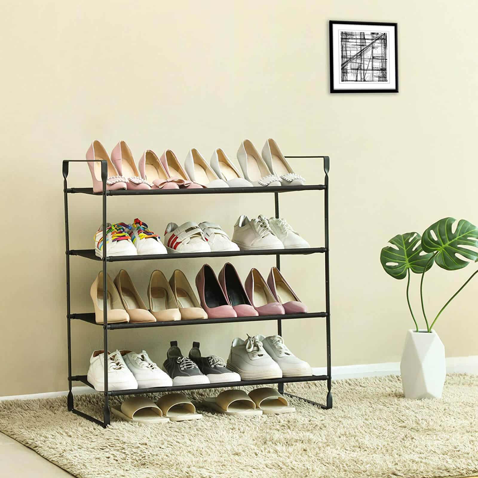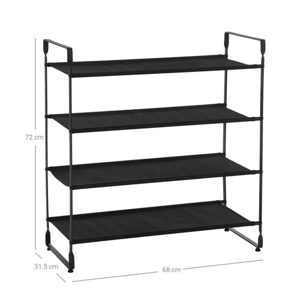 Medžiaginė lentyna batams, 4 lygių LSO04BK, yra puikus sprendimas tvarkingai laikyti batus ir kitus daiktus. Ši lentyna pagaminta iš milteliniu būdu dengtos geležies ir 600 D Oksfordo audinio, užtikrinančio ilgaamžiškumą ir patvarumą.