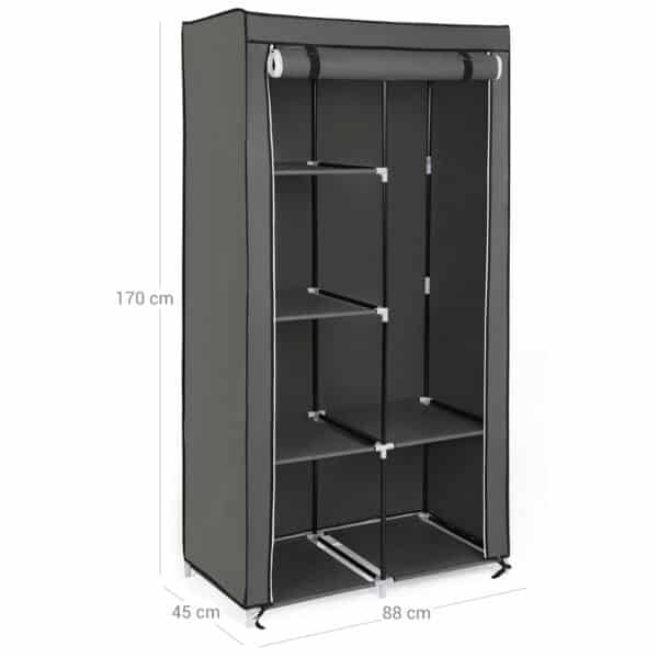 Dėka kelių lentynų kairėje, medžiaginė spinta yra labai stabili. Spinta su rūbų kabykla ir lentynomis leidžia praktiškai padalinti erdvę ir paverčia spintą itin funkcionalia. Pavyzdžiui, kelnės, marškinėliai ir marškiniai gali būti pakabinti be raukšlių, o maišai, batai, šalikai ir kiti daiktai gali būti efektyviai rūšiuojami. Kaip tikras „taupantis erdvę“ sprendimas, ši spinta tinka bet kurioje patalpoje, pavyzdžiui, svetainėje, miegamajame ar namų apyvokos kambaryje.