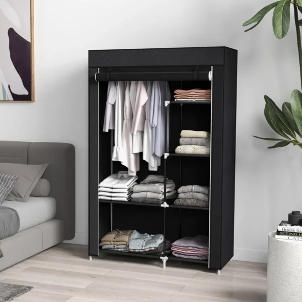 Ši HOMCOM medžiaginė spintelė jūsų namuose sutvarkys. Dėl savo universalaus dizaino ši spinta idealiai tinka bet kokiai patalpai, kuriai reikia papildomos vietos. Jame yra 1 drabužių kabykla ir 6 lentynos drabužiams, rankšluosčiams, patalynei ar krepšiams tvarkyti ir laikyti. Medžiaginis užvalkalas puikiai apsaugo jūsų daiktus nuo dulkių – idealus organizacinis sprendimas!