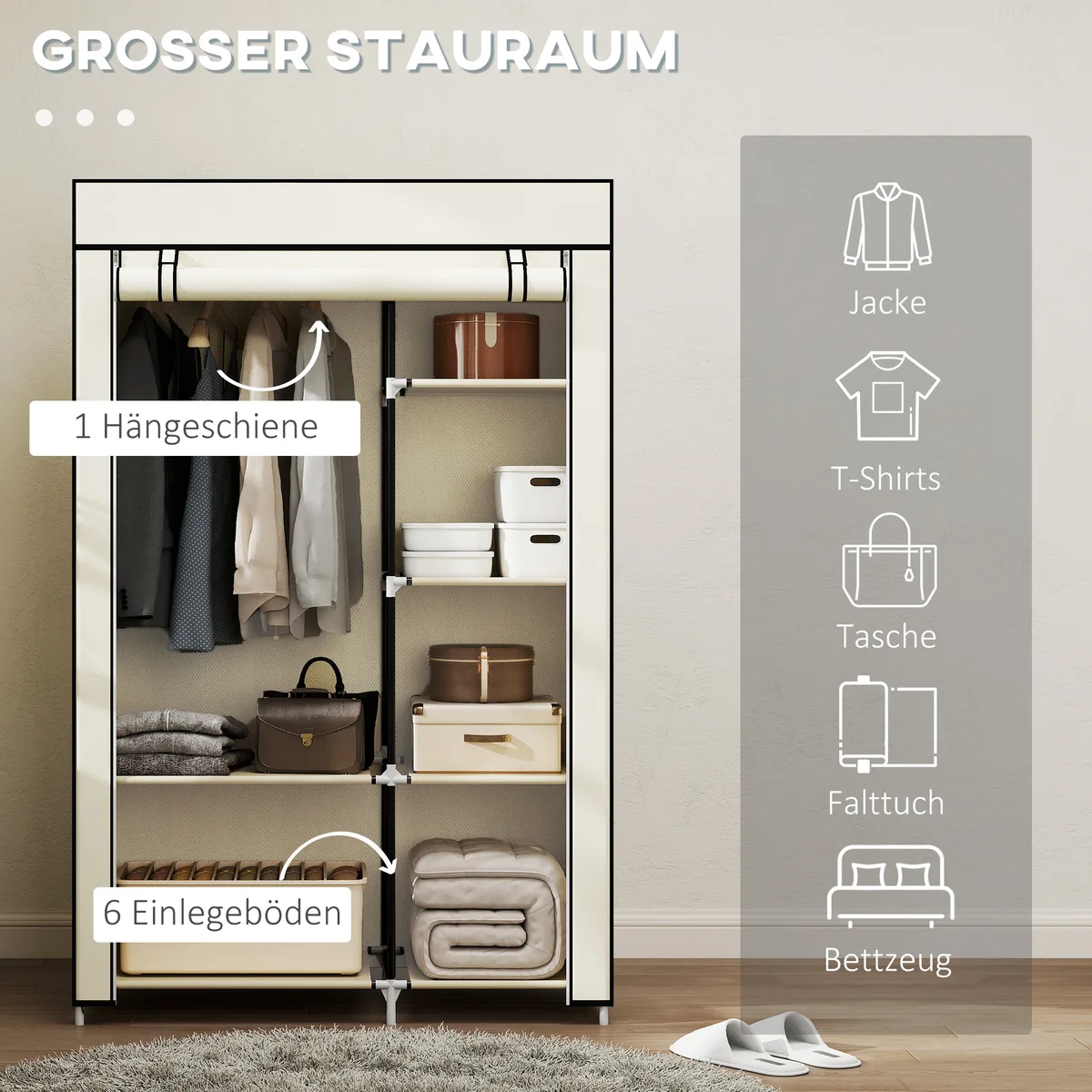 - ✔ Medžiaginė spinta, idealiai tinka miegamiesiems, sandėliukams, garažams, skalbykloms ir pan.