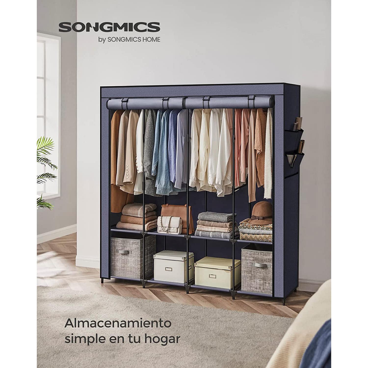 Ši medžiaginė spinta su 4 drabužių kabyklomis ir 4 šoninėmis kišenėmis yra puikus sprendimas jūsų drabužių laikymui. Jos elegantiška šalavijų žalia spalva suteiks jūsų interjerui šviežumo ir stiliaus.