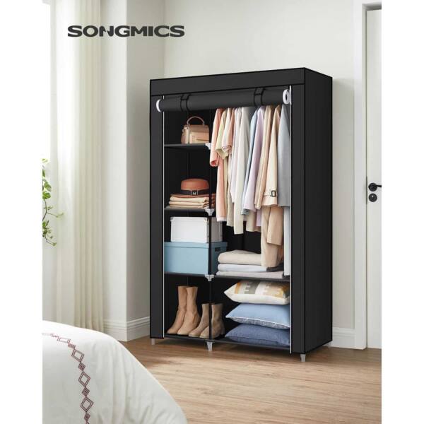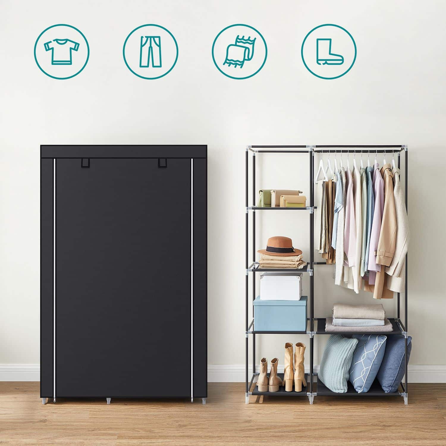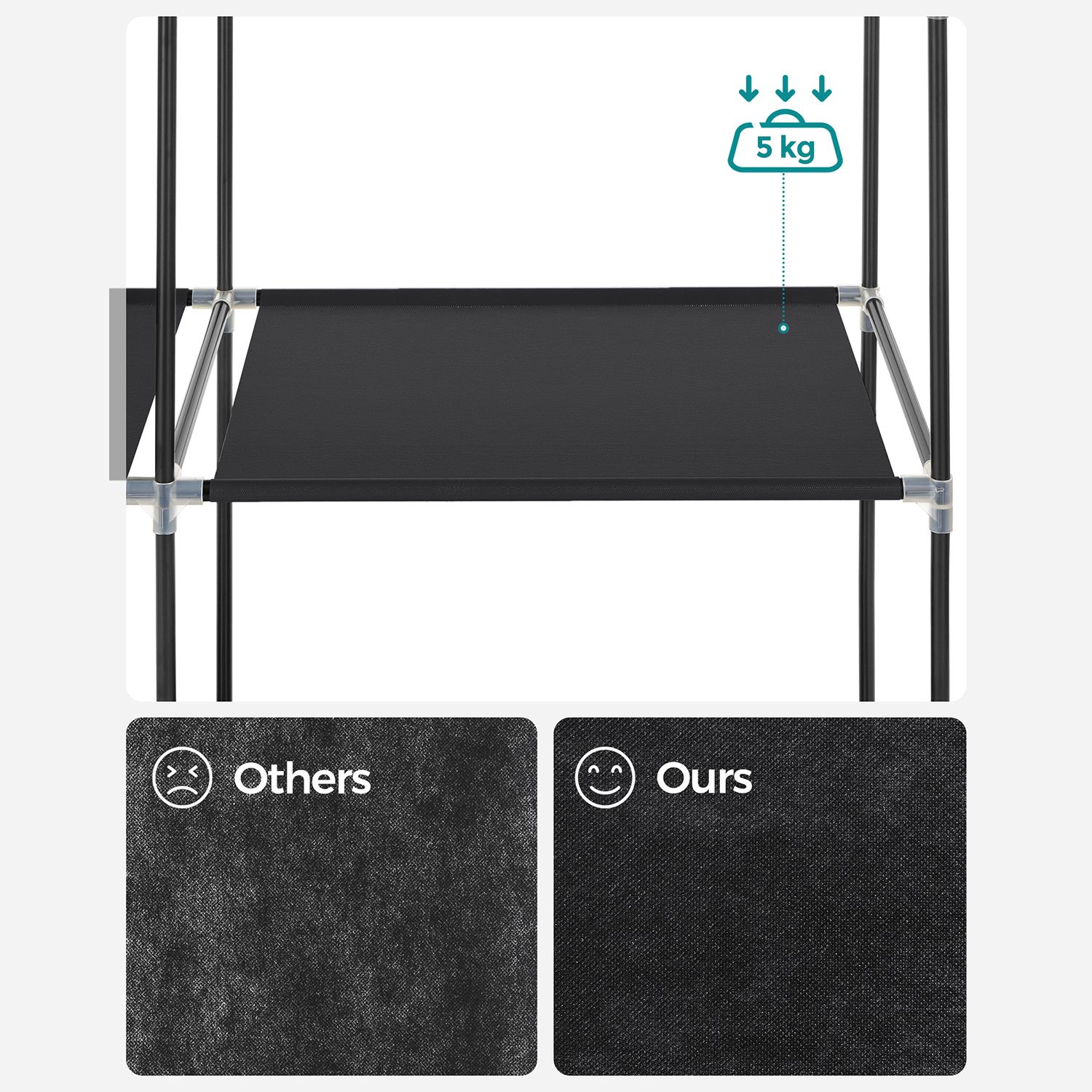 Medžiaginė spinta su drabužių kabykla ir lentynomis, juodos spalvos