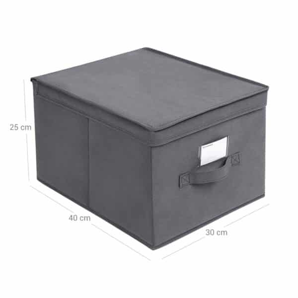 Ši didelė organizatoriaus dėžutė su dangteliu yra atspari dulkėms ir sulankstoma. Integruotas PP etiketės langelis leidžia pažymėti saugomus daiktus. Super erdvi dėžė be pagrindo (išmatavimai: 40 x 25 x 30 cm ) telpa drabužiai, žaislai, žurnalai ir kt.