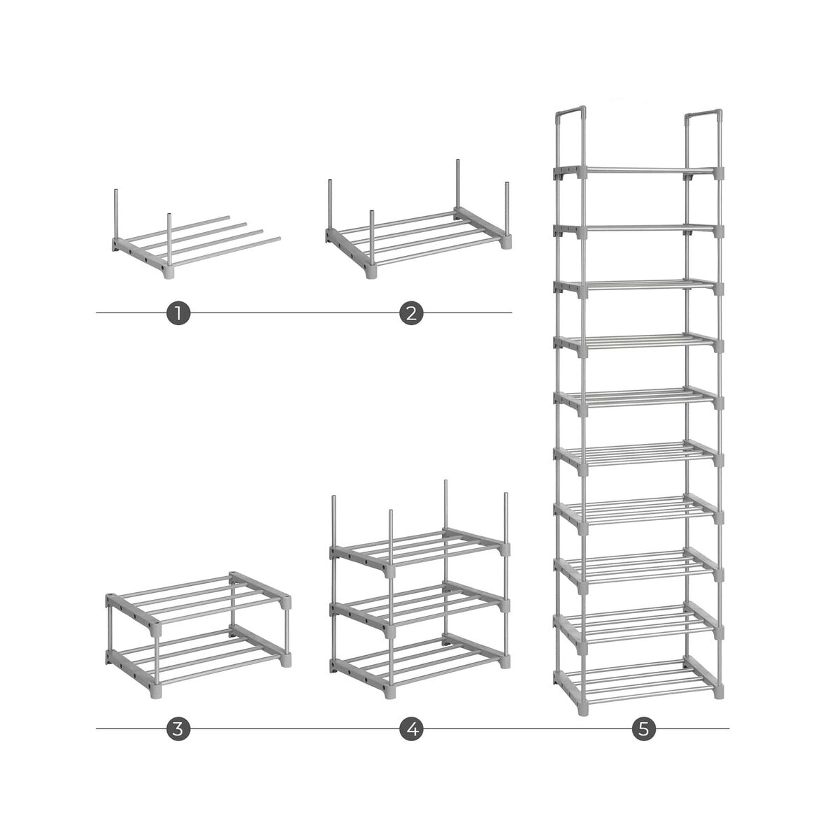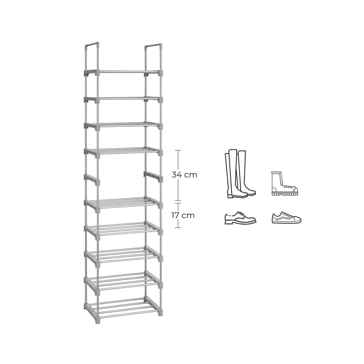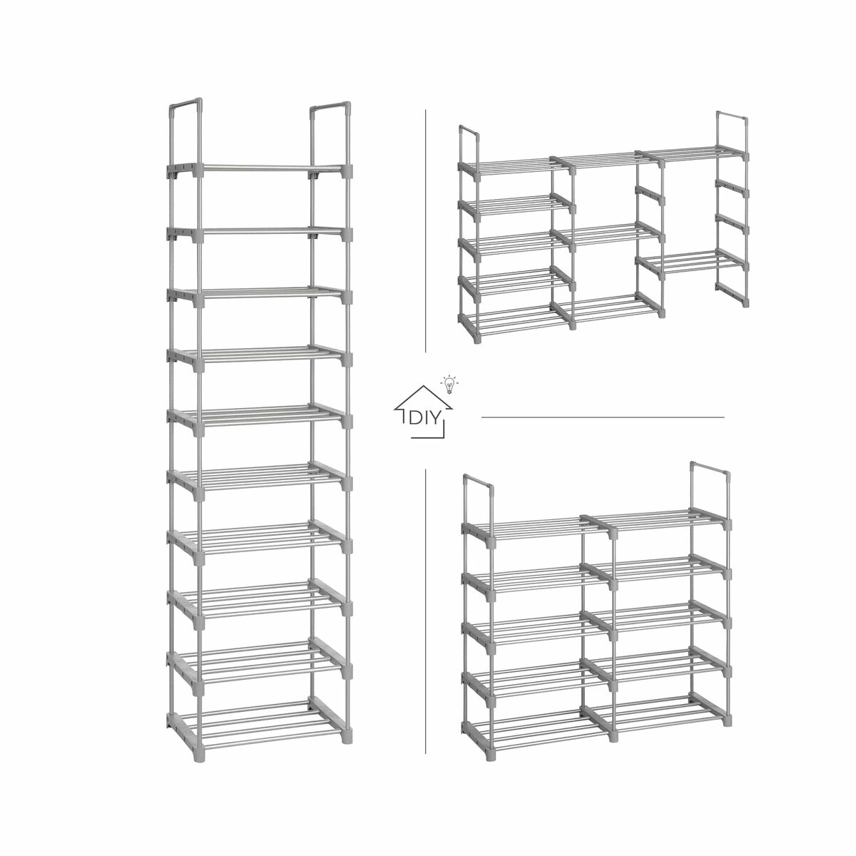 Tvarka džiugina! Kasdien grįžus namo jus užvaldo batų chaosas jūsų koridoriuje? Tai gali sugadinti nuotaiką. Ši SONGMICS 10 pakopų batų lentyna padės išvalyti netvarką ir atrasti vidinę ramybę. Pagaminta iš sustiprintų metalinių vamzdžių ir aukštos kokybės plastikinių jungčių, ši lentyna jūsų batams tvirtai laikosi (kiekviena lentyna gali išlaikyti iki 5 kg). Ji taip pat stebina savo sumaniu „pasidaryk pats“ dizainu ir paprastu surinkimu. Kas valdo chaosą, tas valdo gyvenimą! Pasilepinkite šiuo vietos taupančiu stovu su 10 lentynų ir išvengsite batų chaoso.