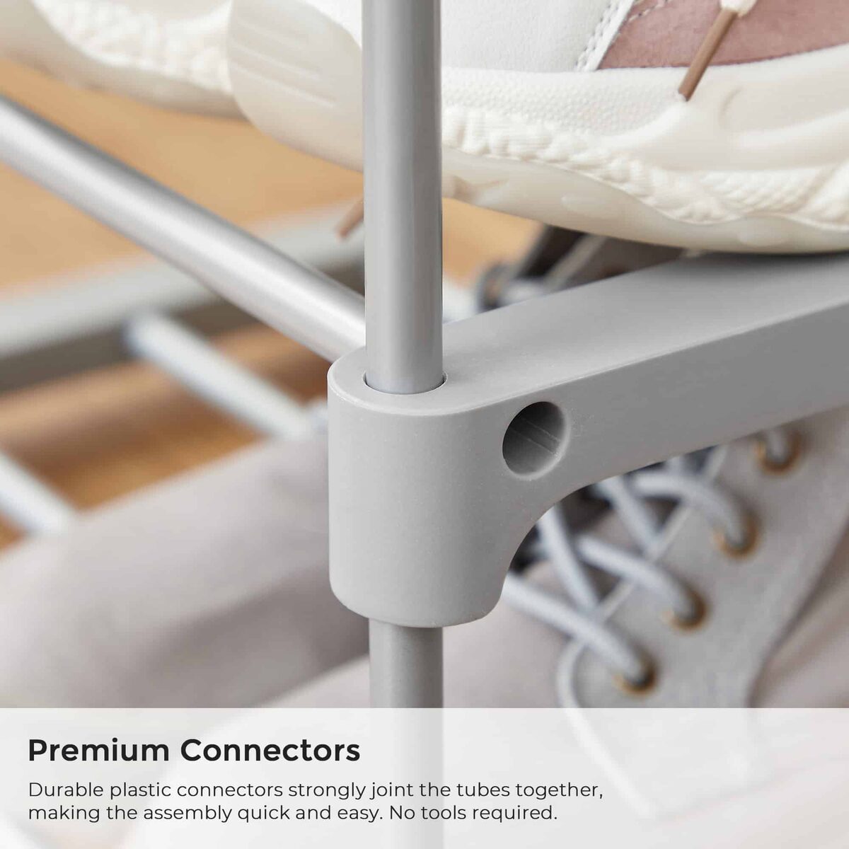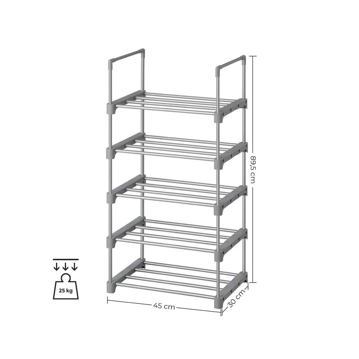 Tvarka džiugina! Kasdien grįžus namo jus užvaldo batų chaosas jūsų koridoriuje? Tai gali sugadinti nuotaiką. Ši SONGMICS 5 pakopų batų lentyna padės išvalyti netvarką ir atrasti vidinę ramybę. Pagaminta iš sustiprintų metalinių vamzdžių ir aukštos kokybės plastikinių jungčių, ši lentyna jūsų batams tvirtai laikosi (kiekviena lentyna gali išlaikyti iki 5 kg). Ji taip pat stebina savo sumaniu „pasidaryk pats“ dizainu ir paprastu surinkimu. Kas valdo chaosą, tas valdo gyvenimą! Pasilepinkite šiuo vietos taupančiu stovu su 5 lentynomis ir suvaldykite batų chaosą.