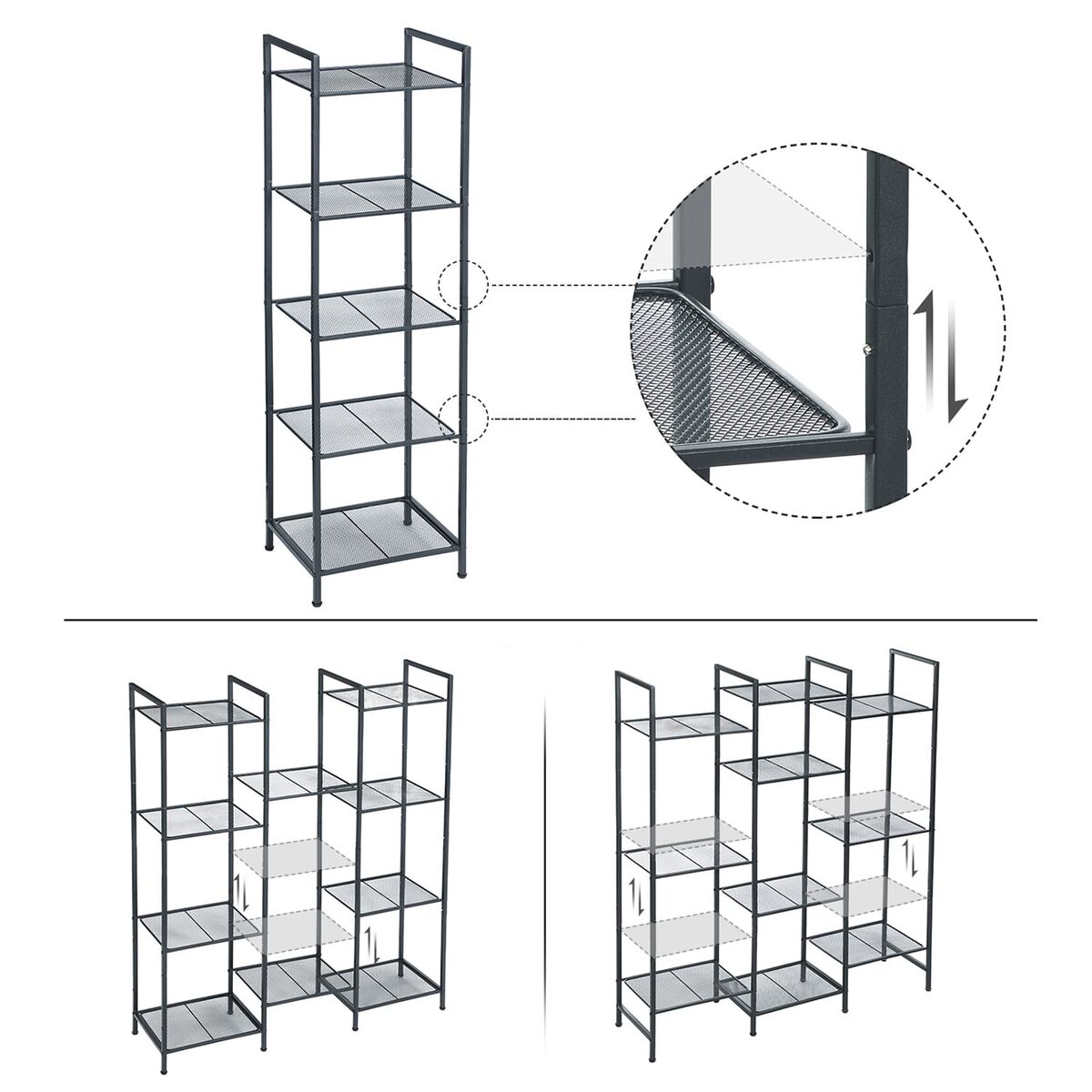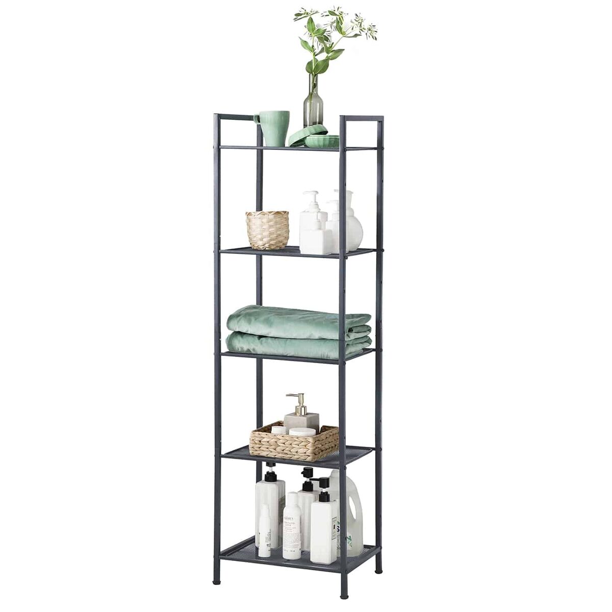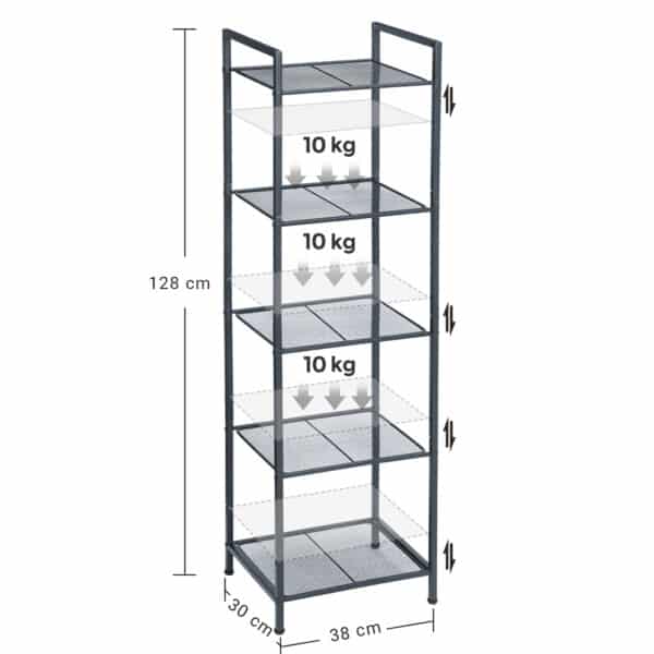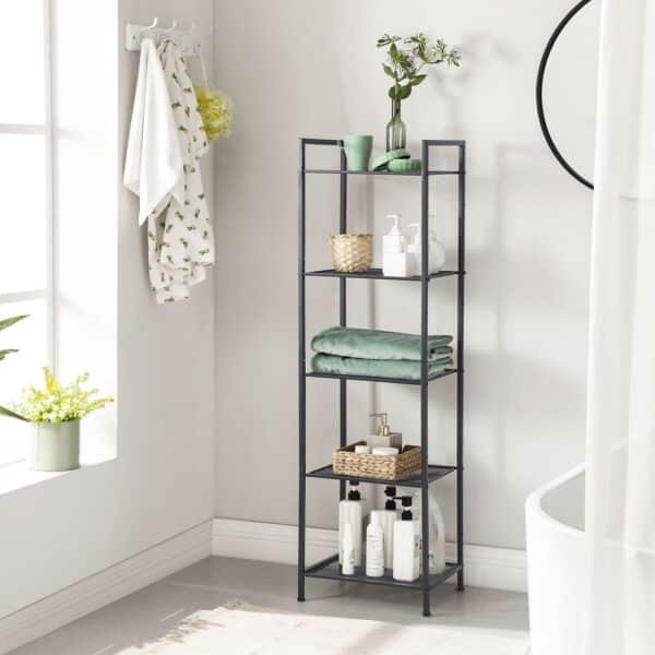 Ši metalinė lentyna su 5 lygiais BSC35BK yra puikus sprendimas jūsų vonios kambariui. Dėl reguliuojamo aukščio lentynų galite laikyti įvairių dydžių daiktus, o galimybė sujungti kelias lentynas leidžia sukurti daugiau vietos. Kompaktiška konstrukcija užima mažai grindų ploto, todėl puikiai tinka mažoms erdvėms.