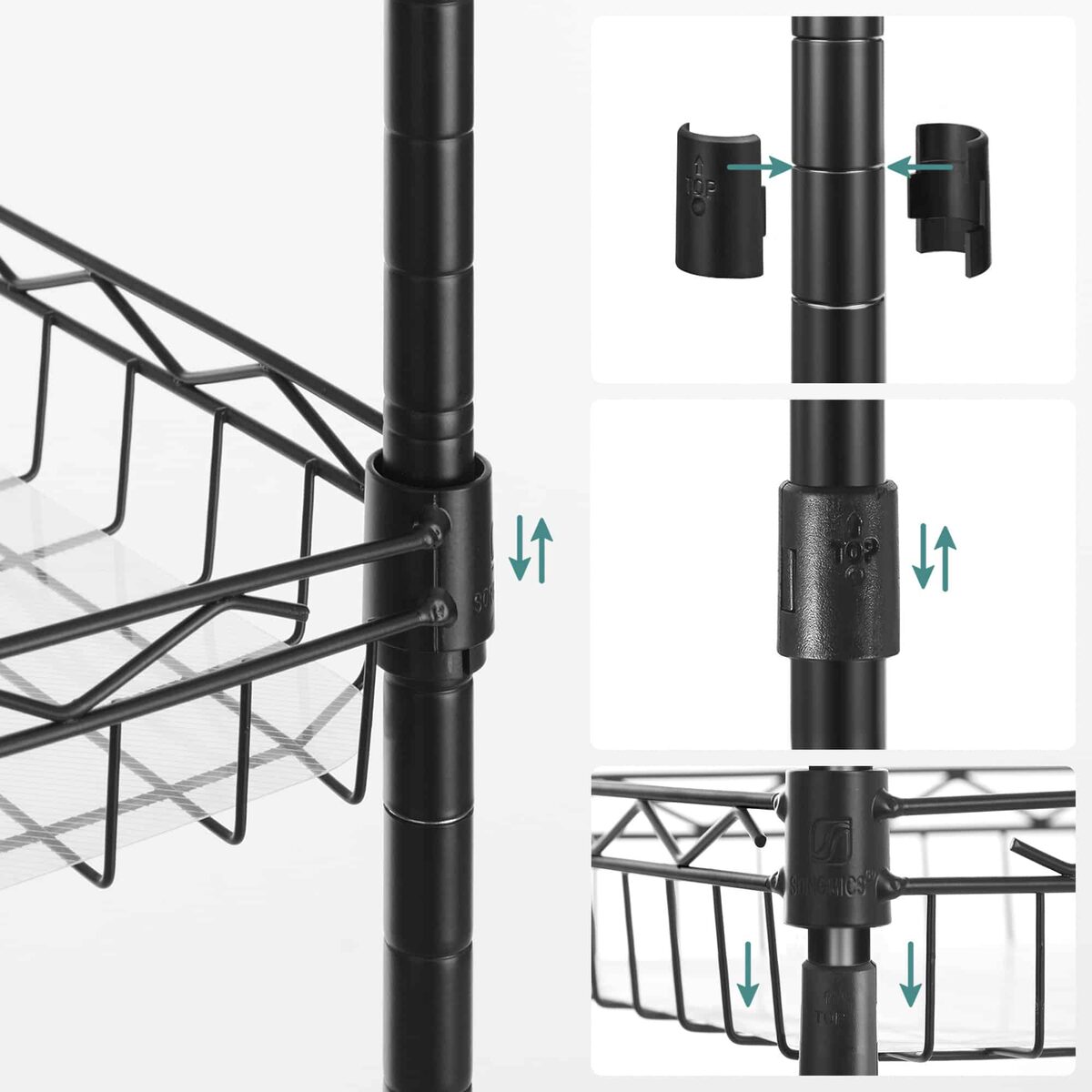 - Įsitikinkite, kad atraminiai spaustukai yra pritvirtinti prie 4 vamzdžių tame pačiame aukštyje, kad lentynos būtų horizontalioje plokštumoje.
