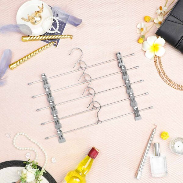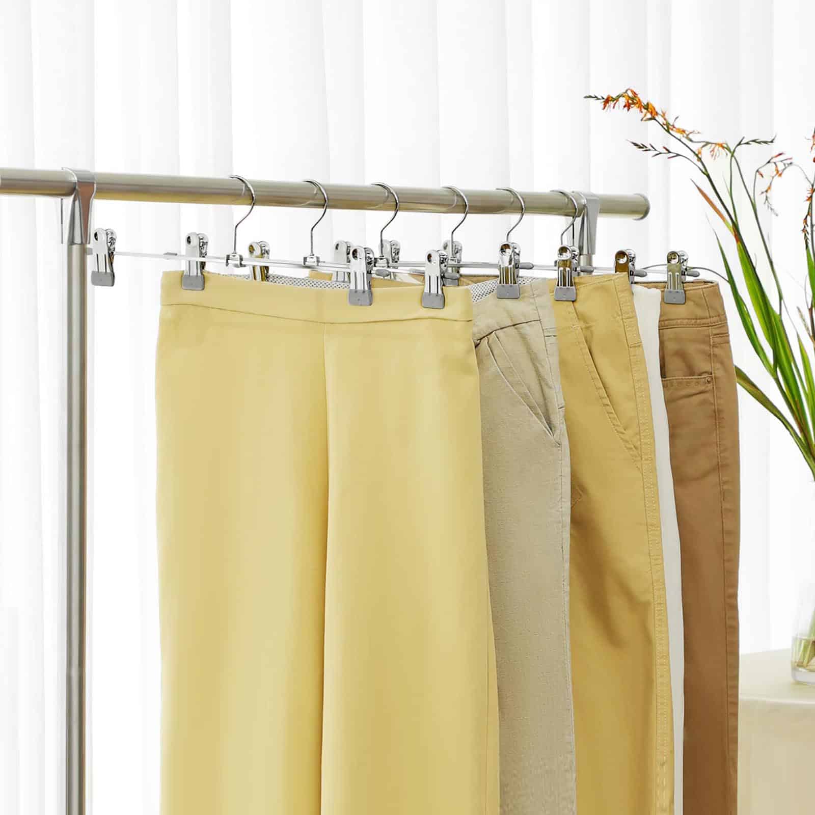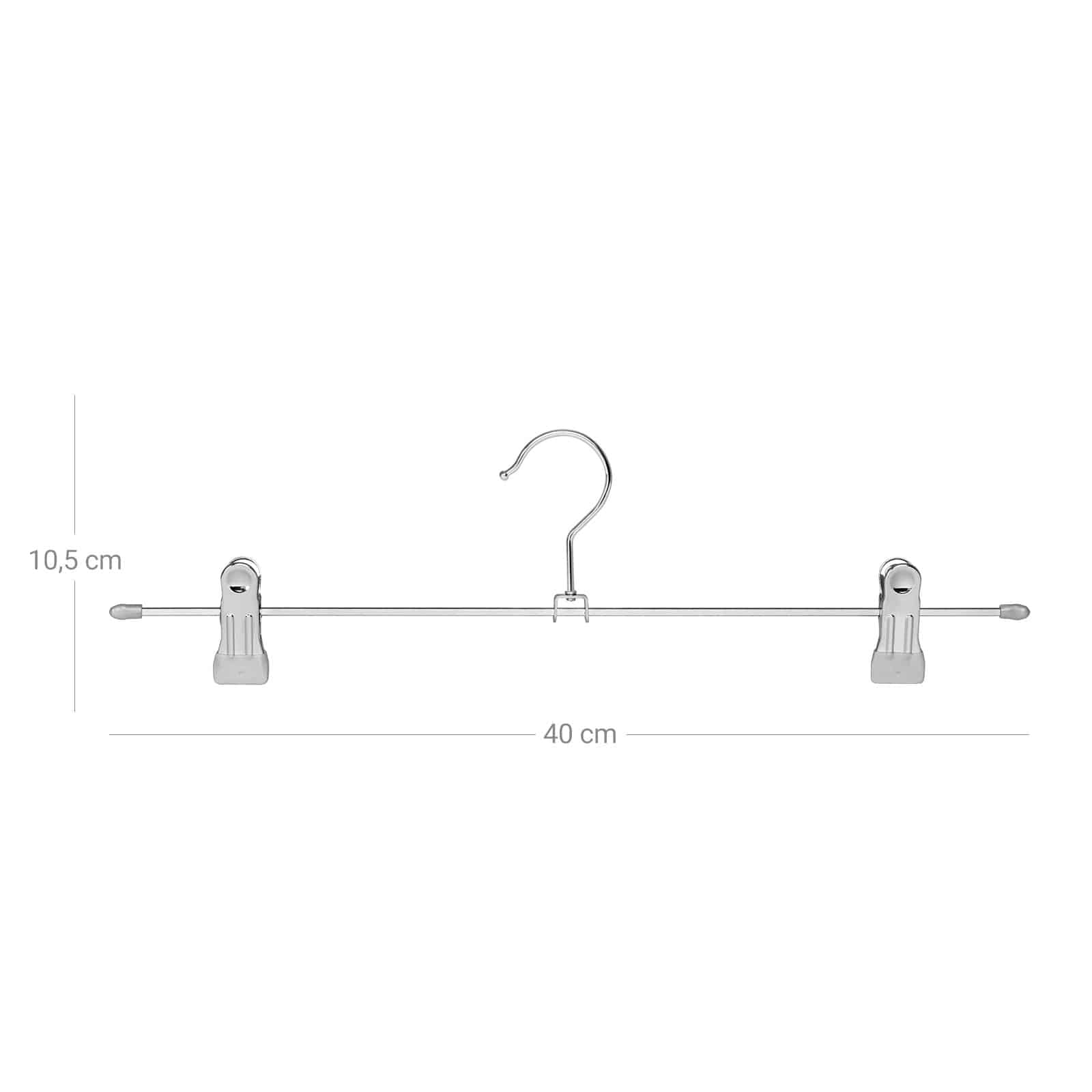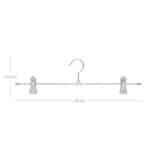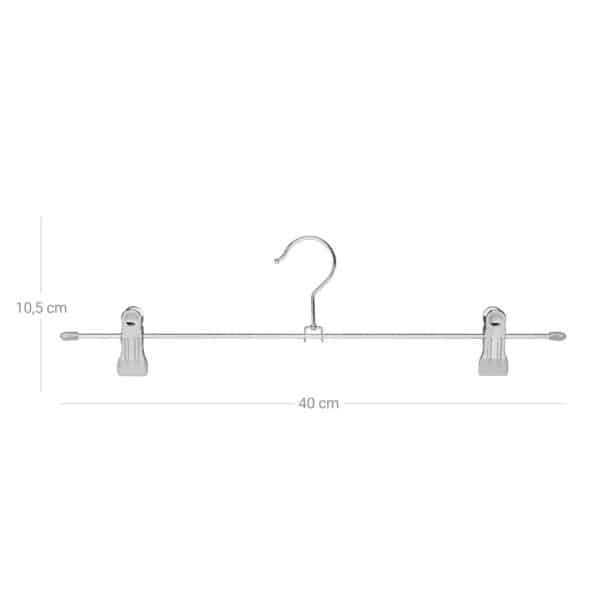 Šios metalinės kelnių pakabos yra itin praktiškos ir funkcionalios. Pagamintos iš Ø 3,4 mm metalinių vielų, jos yra plonos ir taupo vietą. Be to, šios pakabos yra labai elastingos ir gali atlaikyti iki 3 kg svorį. Galite pakabinti įvairius drabužius, tokius kaip kelnės, sijonai ir kūdikių drabužiai. Sąvaržėlės gali būti reguliuojamos iki 40 cm, todėl jos tinka įvairių dydžių drabužiams. PVC dengti segtukai užtikrina, kad jūsų drabužiai nenukristų. Chromuotas paviršius yra stilingas ir nerūdijantis, o kablys sukasi 360° kampu, suteikdamas dar daugiau patogumo.