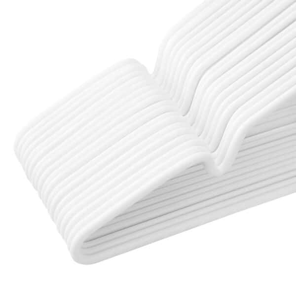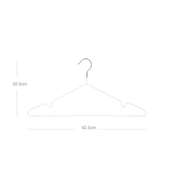 Balta PVC danga ant pakabų neleidžia jūsų palaidinėms slysti ant grindų. Išlenkti pakabos pečiai apsaugo jūsų kostiumus, marškinius ar švarkus nuo susiglamžymo. Praktiški įpjovimai išlaiko sukneles ar viršutinius drabužius vietoje.