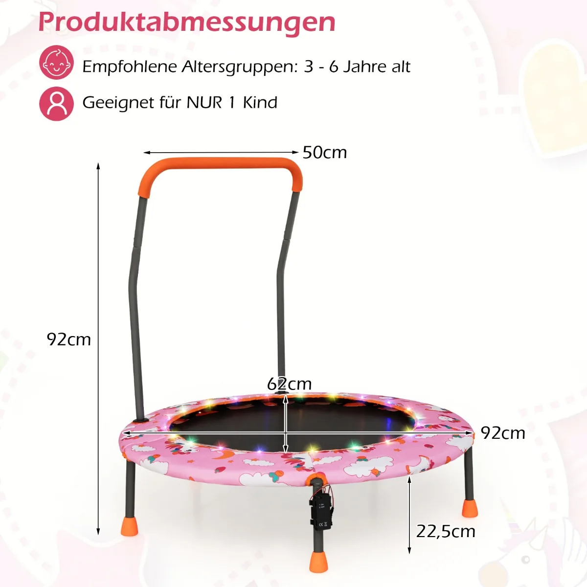 Mini batutas 92×92 cm rožinės ir juodos spalvos skirtas vaikams nuo 3 iki 6 metų. Šis mažas batutas suteikia galimybę vaikams aktyviai judėti, lavinti motoriką ir pusiausvyrą saugioje aplinkoje. Dėl LED apšvietimo ir pritaikytos konstrukcijos jis pritraukia vaikų dėmesį ir skatina judėjimą.