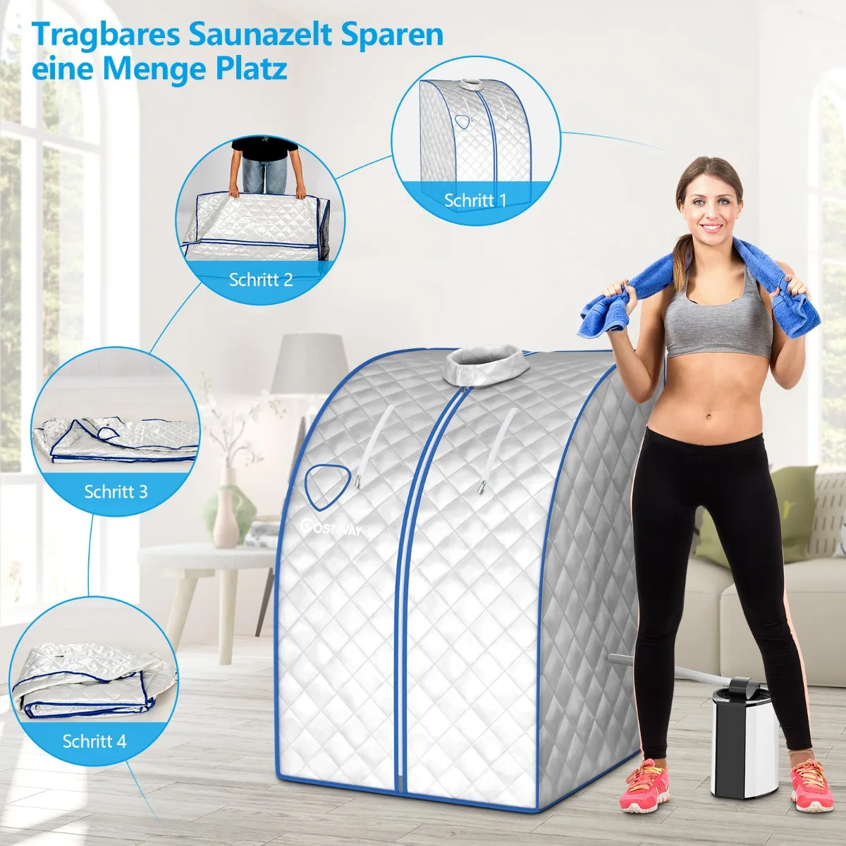 Mini garinė pirtis 78x87x100cm sidabrinės spalvos puikiai tinka naudoti namų SPA procedūroms. Kompaktiško dydžio garinė pirtis su 3 l nerūdijančio plieno bako garų katilu ir nuotoliniu valdymu leidžia reguliuoti temperatūrą bei naudojimo trukmę patogiai bei saugiai.